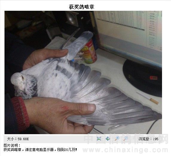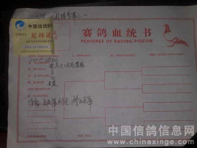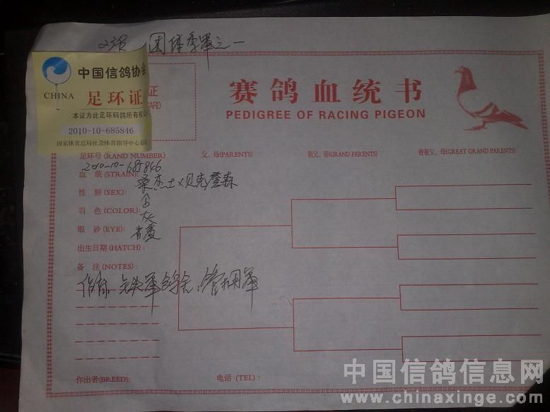 各位信鸽爱好者: 大家好! 金鹰有幸在盐都区飞了个总冠军,实属意料之外,本身冠军的父母都没有花银子,而且绝对的粗饲养,从开始到结束全部只喂玉米,鸽舍一年打扫一次,私训一次都没放过,只跟金鹰赛鸽车放过一站100,一站300,直接上500,200公里忙忘记了,等赛鸽车出发了才想起来自己鸽子还没放呢,由于金鹰100公里就算比赛,一直在电脑前工作,冠军鸽训放什么时候回来我自己也不知道,决赛前两个月被猫袭击了两次,吓的赛鸽好几天不敢进笼!决赛当天逆风,闷热,天气相对恶劣,冠军是2010年5月底套的秋百日赛和11年春大奖赛,百日赛时由于肌肉很软(和500公里上笼时一样)没有舍得放,因为30元和100元我肯定选择后者,500公里集鸽时请周林和王学洪帮我填单子套电子环,安邦保险刘兵坚持要指定这羽花雄,我坚决反对,我以为这羽冠军根本不会回来,反而劝他指另一羽肌肉骨架血统都很硬样样到位的灰砂雄,结果放五羽当天到两羽次日到两羽,就那羽灰雄没有回来,赛鸽的学问真的很难捉摸,在鼎胜决赛上笼四羽当天到四羽,归巢100%最好名次108名,如果我尽心的服侍赛鸽,成绩肯定会更好!金鹰一直想回报大家,现在终于有了机会,谈不上支持盐城信鸽,只想为盐城鸽界尽一份力“大家好才是真的好”。现将冠军父母,冠军平辈子代无偿送给喜欢花鸽并支持金鹰的鸽友!13291365577 13961930014