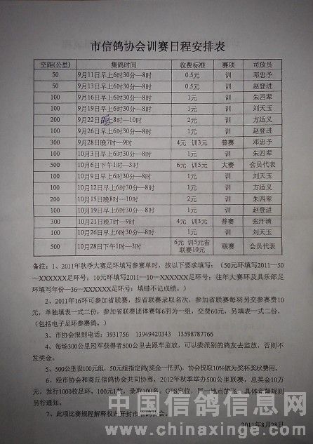 开封市信鸽协会2011年秋季训赛日程安排表