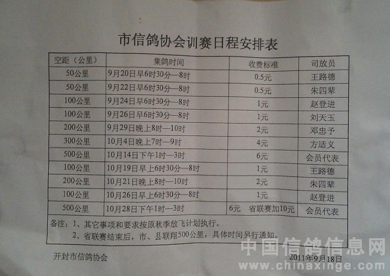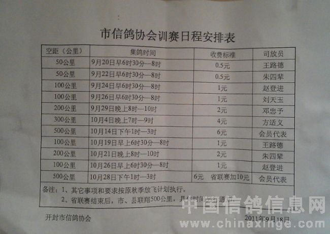 市信鸽协会训赛日程安排表