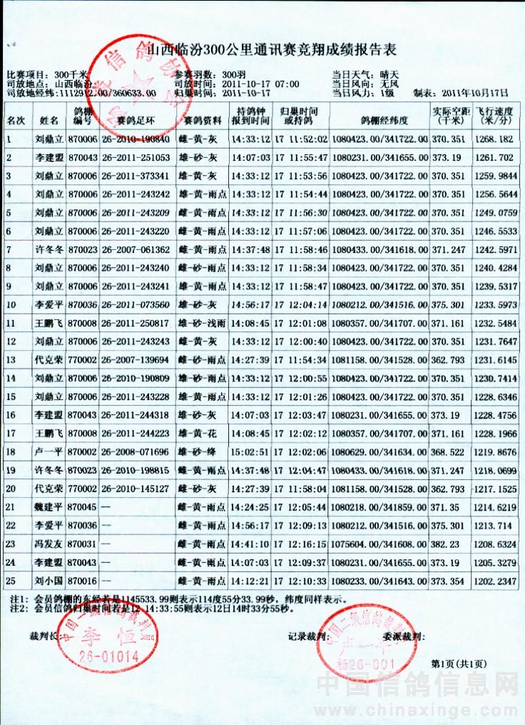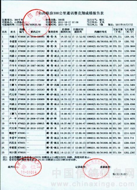 山西临汾300公里通讯赛竞翔成绩