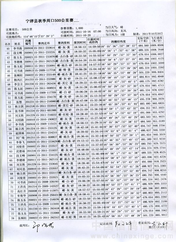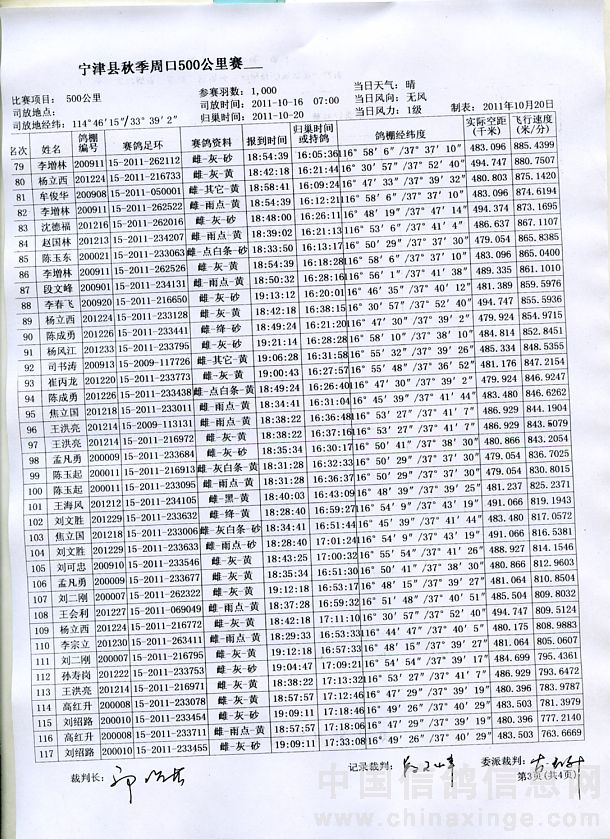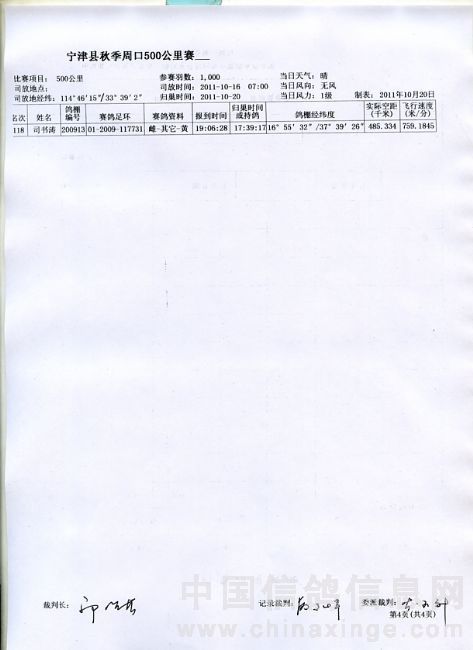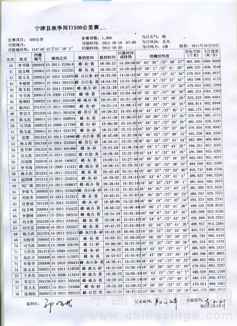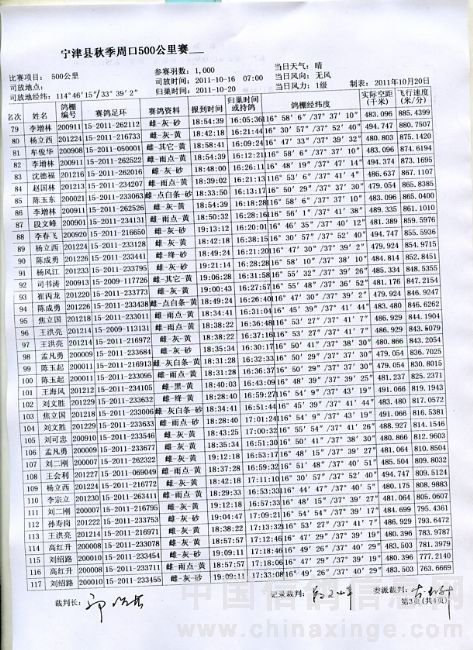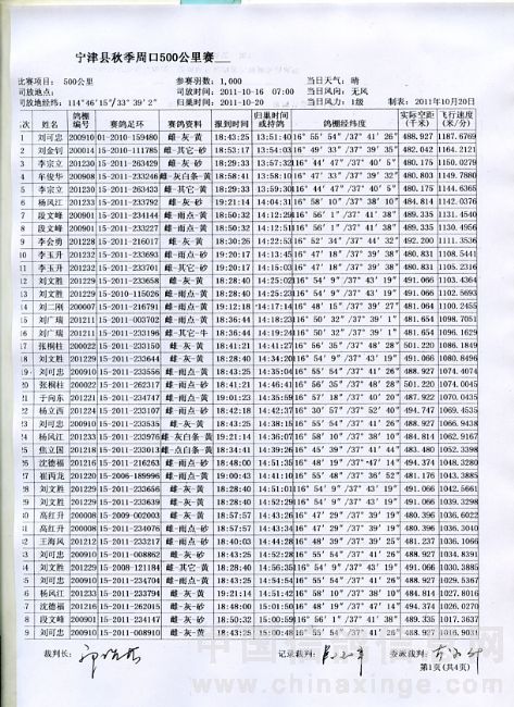 2011年秋季500公里归巢名单