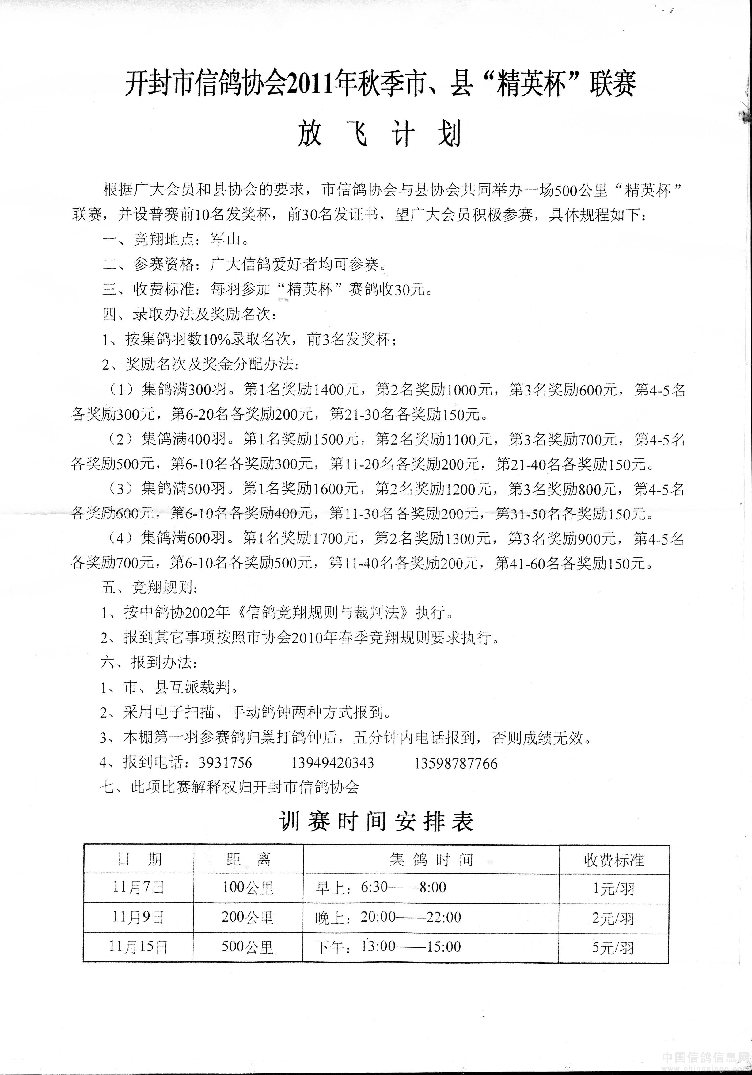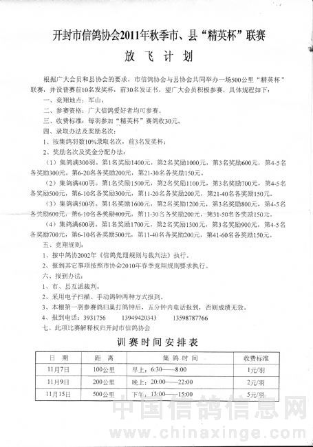 开封市信鸽协会2011年秋季市、县“精英杯”联赛放飞计划