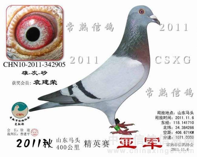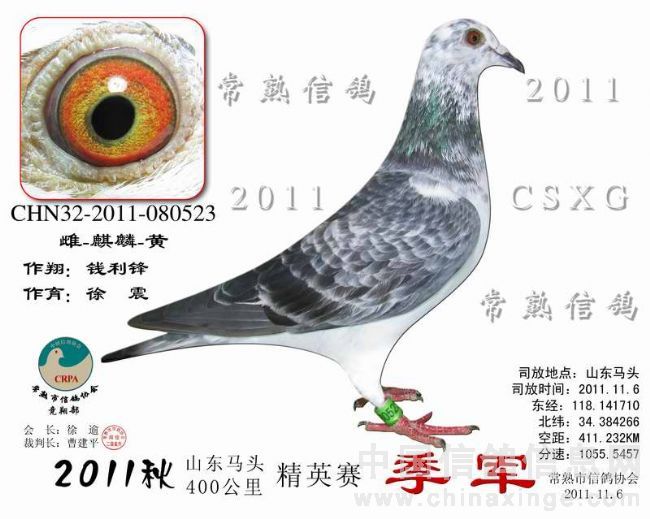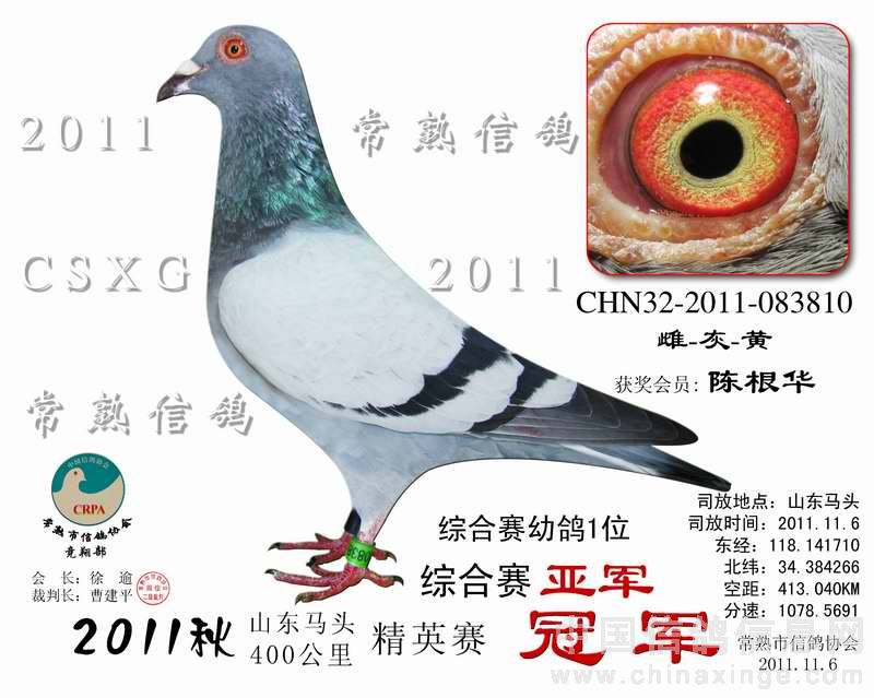 -------------------------------------------------------------------------------------------- 司放地点: 山东马头 司放时间: 2011-11-06 07:20:00 经纬度: 118.141710 E,34.384266 N -------------------------------------------------------------------------------------------- 名 次 鸽主姓名 棚号 足环号码 归巢时间 空距(千米) 分速(米/分) -------------------------------------------------------------------------------------------- 1 陈根华 050128 2011-32-083810 2011-11-06 13:42:57 413.040 1,078.5691 -------------------------------------------------------------------------------------------- 2 袁建荣 050311 2011-10-342905 2011-11-06 13:39:42 406.671 1,071.0300 -------------------------------------------------------------------------------------------- 3 钱利锋 050256 2011-32-080523 2011-11-06 13:49:35 411.232 1,055.5457 -------------------------------------------------------------------------------------------- 4 徐 逾 050001 2011-10-523016 2011-11-06 13:51:32 413.213 1,055.3406 -------------------------------------------------------------------------------------------- 5 薛建中 050015 2011-10-341553 2011-11-06 13:46:46 406.042 1,049.7996 -------------------------------------------------------------------------------------------- 6 徐 逾 050001 2011-32-079839 2011-11-06 13:54:18 413.213 1,047.9470 -------------------------------------------------------------------------------------------- 7 胡利军 050314 2011-10-341444 2011-11-06 13:53:26 408.271 1,037.6970 -------------------------------------------------------------------------------------------- 8 瞿雪祥 050047 2011-10-341323 2011-11-06 13:56:10 409.313 1,033.1782 -------------------------------------------------------------------------------------------- 9 胡利军 050314 2011-10-341447 2011-11-06 13:55:12 408.271 1,033.0513 -------------------------------------------------------------------------------------------- 10 陈根华 050128 2011-10-340077 2011-11-06 14:00:26 413.040 1,031.4714 -------------------------------------------------------------------------------------------- 11 严建宏 050127 2011-10-340204 2011-11-06 13:59:46 411.240 1,028.6855 -------------------------------------------------------------------------------------------- 12 Tiger鸽舍 050111 2011-10-346111 2011-11-06 13:55:35 404.596 1,022.7424 -------------------------------------------------------------------------------------------- 13 瞿雪祥 050047 2011-10-341436 2011-11-06 14:00:32 409.313 1,021.9174 -------------------------------------------------------------------------------------------- 14 陈刚 050278 2011-10-340116 2011-11-06 13:56:51 403.782 1,017.4351 -------------------------------------------------------------------------------------------- 15 徐 逾 050001 2011-10-340010 2011-11-06 14:09:20 413.213 1,009.4398 -------------------------------------------------------------------------------------------- 16 盛进宝 050316 2011-10-346472 2011-11-06 14:04:21 407.927 1,008.8450 -------------------------------------------------------------------------------------------- 17 陈刚 050278 2011-10-342842 2011-11-06 14:01:09 403.782 1,006.5611 -------------------------------------------------------------------------------------------- 18 徐 逾 050001 2011-32-075780 2011-11-06 14:10:55 413.213 1,005.5594 -------------------------------------------------------------------------------------------- 19 Tiger鸽舍 050111 2011-10-347111 2011-11-06 14:02:37 404.596 1,004.8838 -------------------------------------------------------------------------------------------- 20 陈根华 050128 2011-32-083815 2011-11-06 14:11:18 413.040 1,004.2146 -------------------------------------------------------------------------------------------- 21 陈刚 050278 2011-10-340943 2011-11-06 14:02:42 403.782 1,002.6848 -------------------------------------------------------------------------------------------- 22 瞿雪祥 050047 2011-10-341435 2011-11-06 14:08:20 409.313 1,002.3718 -------------------------------------------------------------------------------------------- 23 顾雪峰 050385 2011-10-341216 2011-11-06 14:09:02 408.728 999.2376 -------------------------------------------------------------------------------------------- 24 戈国平 050383 2011-32-082709 2011-11-06 13:54:23 393.958 998.8797 -------------------------------------------------------------------------------------------- 25 周姚坤 050315 2011-10-342972 2011-11-06 13:38:55 378.274 998.2741 -------------------------------------------------------------------------------------------- 26 邵停元 050002 2011-10-340101 2011-11-06 14:09:11 407.376 995.5705 -------------------------------------------------------------------------------------------- 27 瞿雪祥 050047 2011-10-341318 2011-11-06 14:11:08 409.313 995.5530 -------------------------------------------------------------------------------------------- 28 杨维益 050273 2011-10-340973 2011-11-06 14:15:08 412.506 993.6699 -------------------------------------------------------------------------------------------- 29 芮永新 050391 2011-10-340042 2011-11-06 14:11:51 408.903 992.8320 -------------------------------------------------------------------------------------------- 30 盛进宝 050316 2011-10-346471 2011-11-06 14:11:35 407.927 991.1140 -------------------------------------------------------------------------------------------- 31 Tiger鸽舍 050111 2011-32-085904 2011-11-06 14:08:16 404.596 990.9874 -------------------------------------------------------------------------------------------- 32 杨祝平 050187 2011-10-342236 2011-11-06 14:11:35 407.423 989.8742 -------------------------------------------------------------------------------------------- 33 徐 逾 050001 2011-32-079866 2011-11-06 14:18:01 413.213 988.4840 -------------------------------------------------------------------------------------------- 34 汤志平 050263 2010-10-509803 2011-11-06 14:12:37 407.144 986.7071 