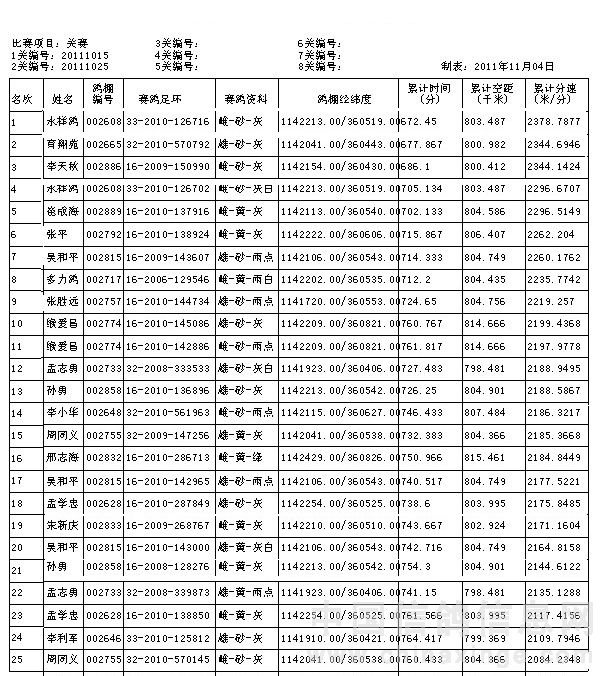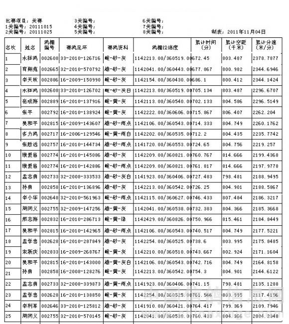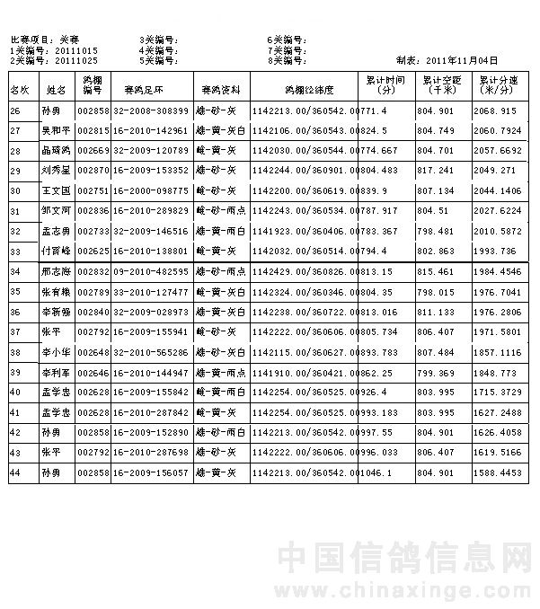 2011年秋成鸽组“卓越星杯”三关赛前两关成绩
