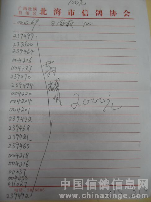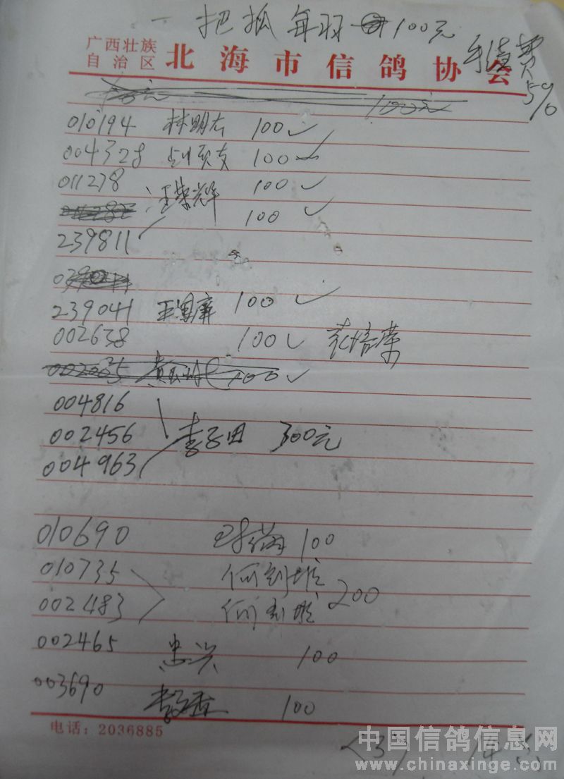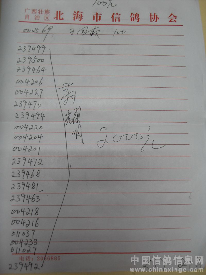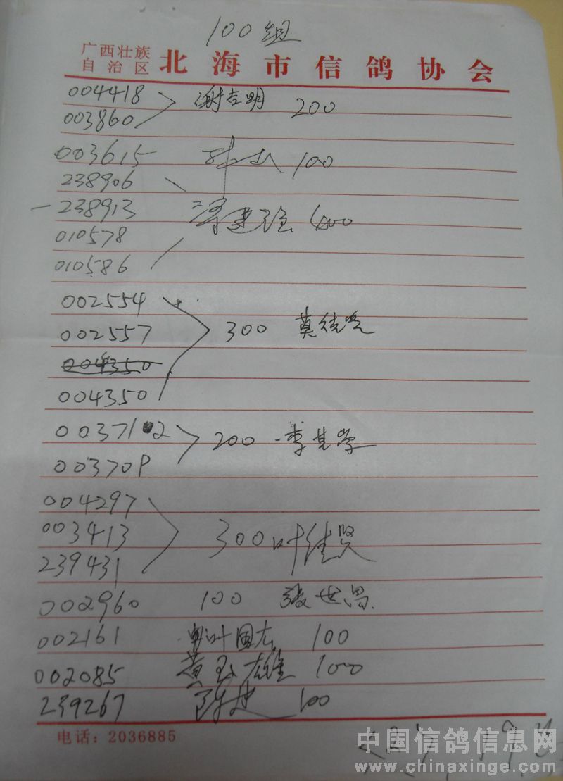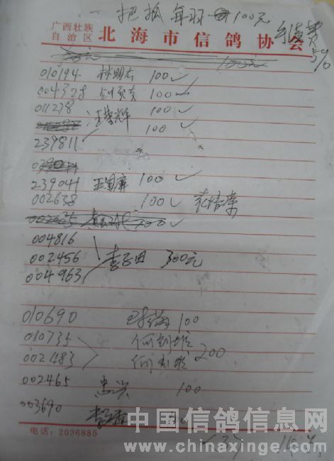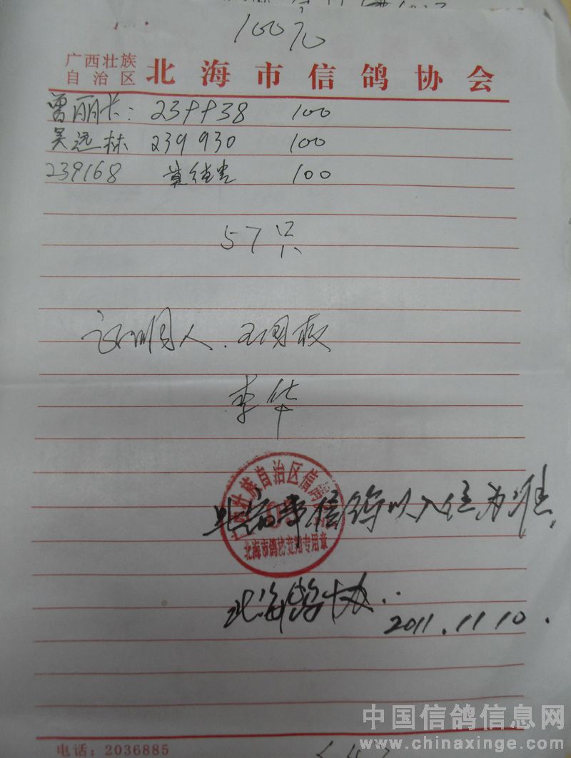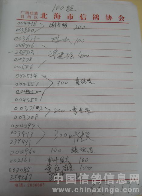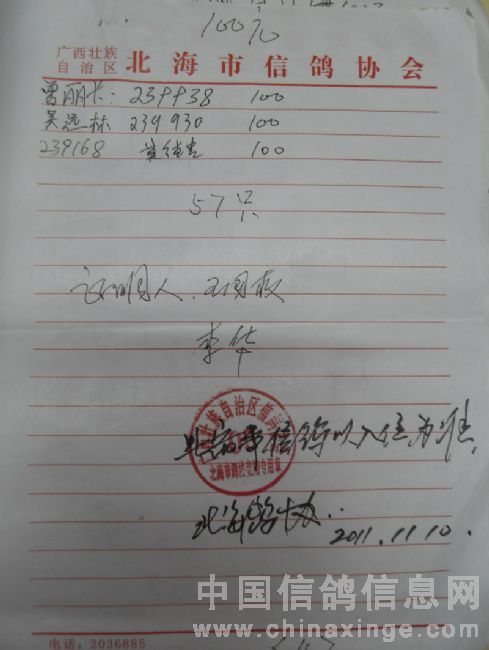 广西北海市信鸽协会2011年下半年东莞大奖100元组指定鸽名单