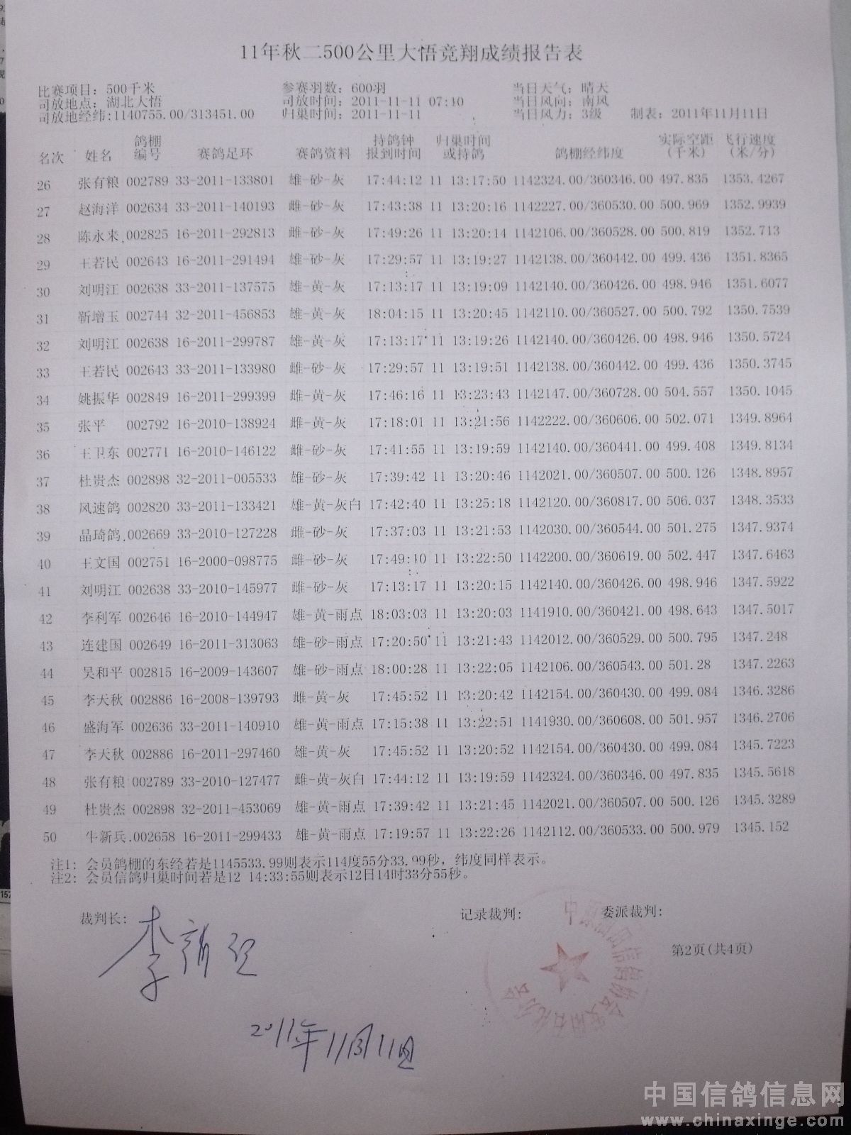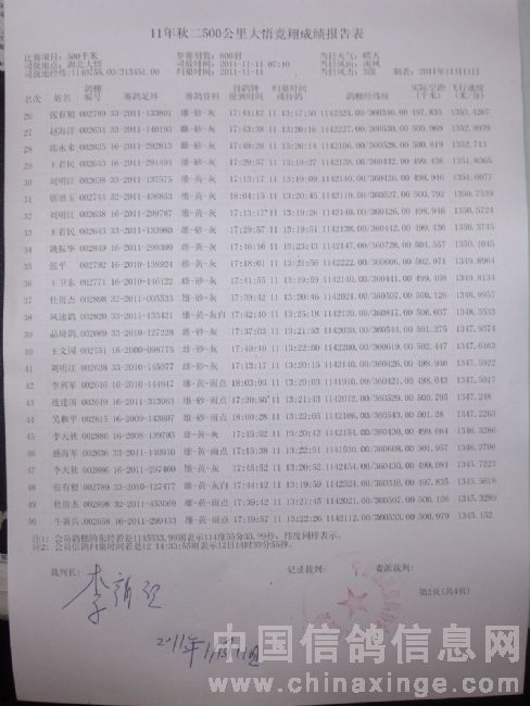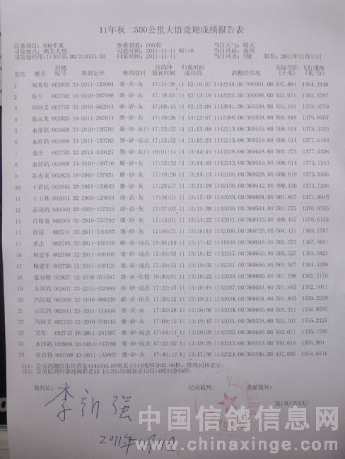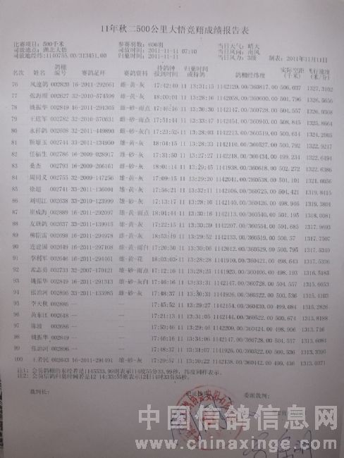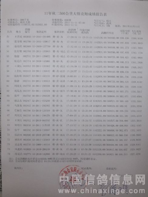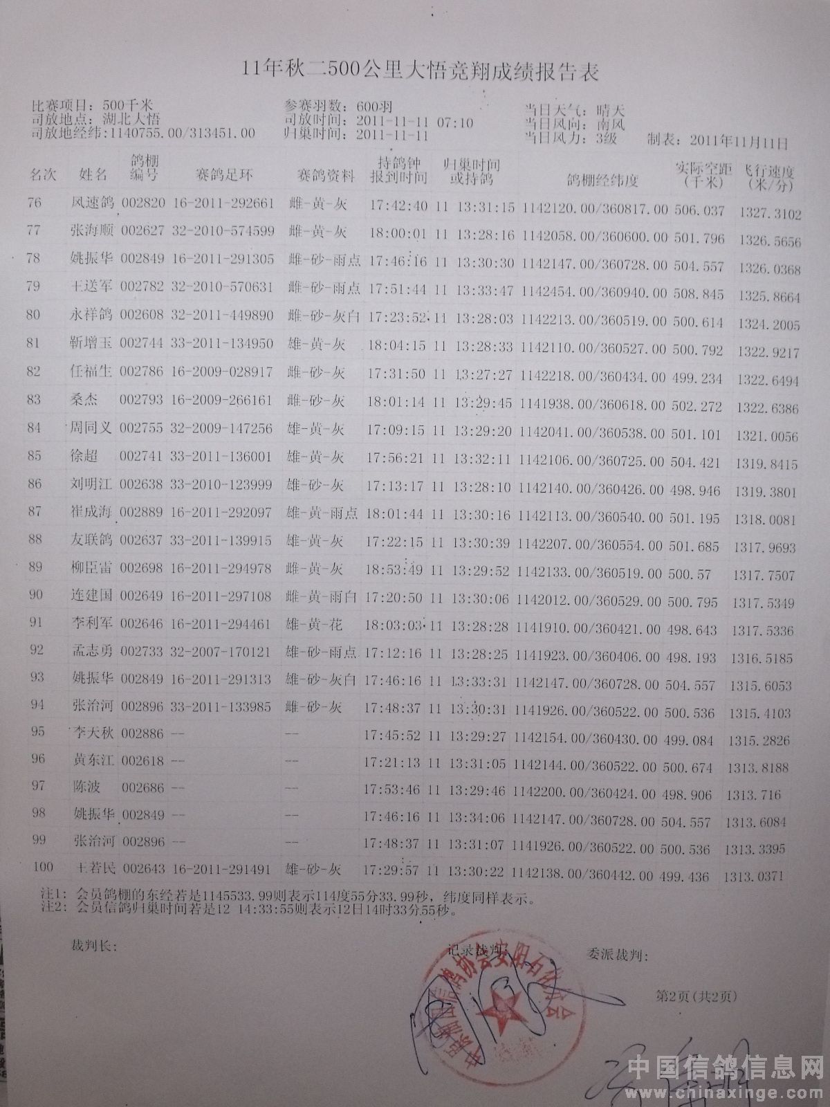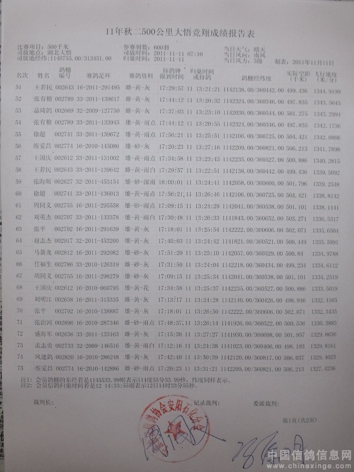 2021年秋500公里大悟大奖赛第二关成、幼鸽指定成绩