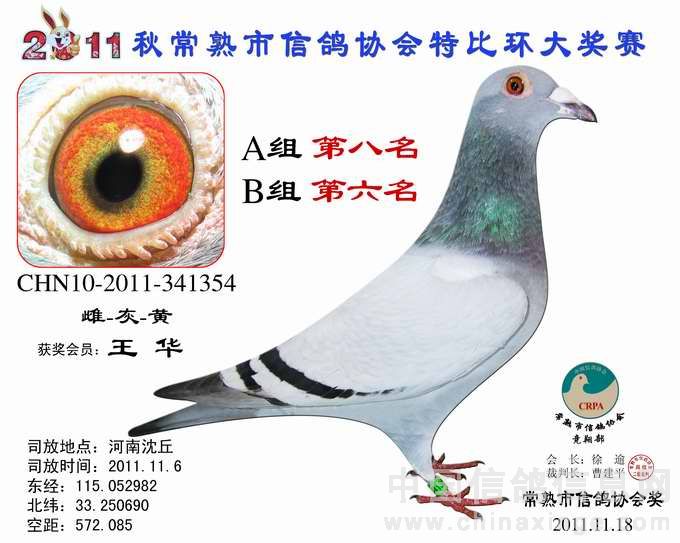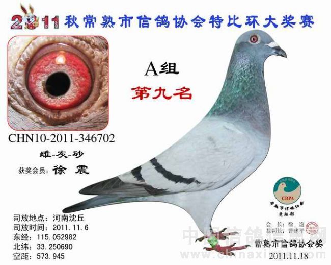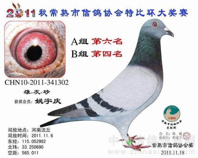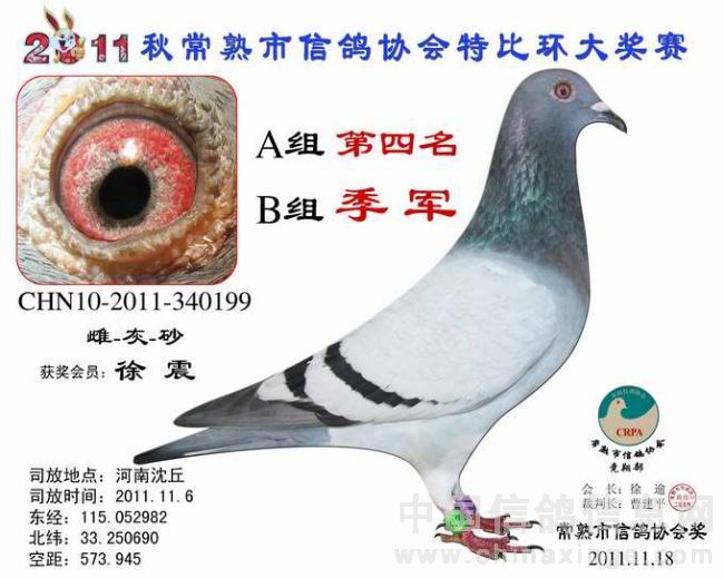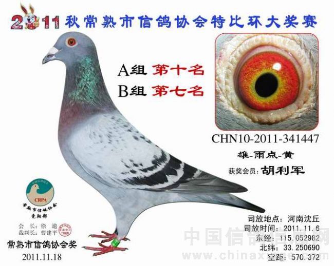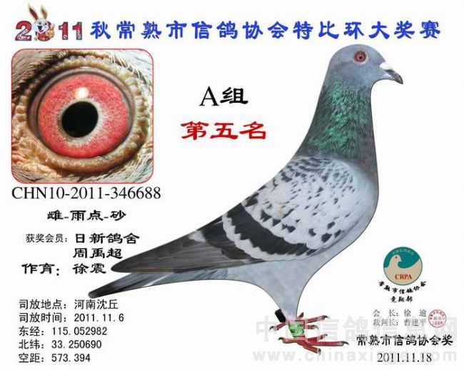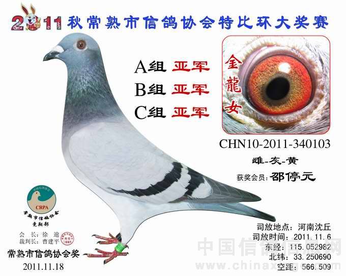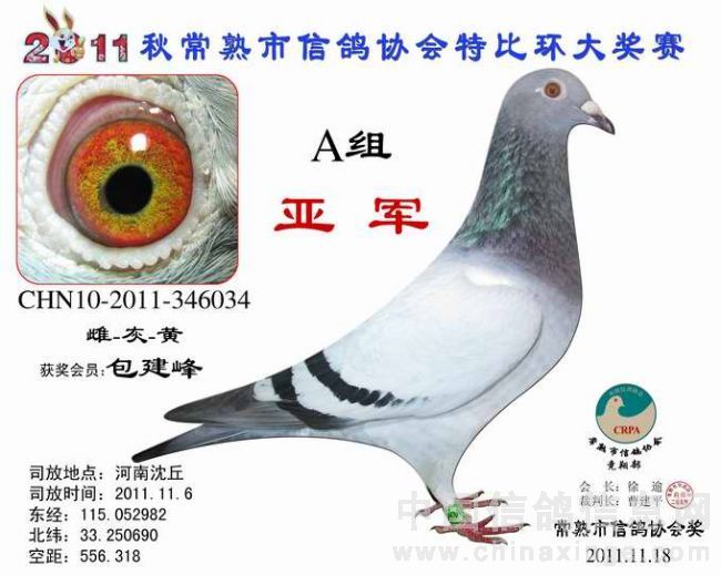 -------------------------------------------------------------------------------------------- 司放地点: 河南沈丘 司放时间: 2011-11-16 07:20:00 经纬度: 115.052982 E,33.250690 N -------------------------------------------------------------------------------------------- 名 次 鸽主姓名 棚号 足环号码 归巢时间 空距(千米) 分速(米/分) -------------------------------------------------------------------------------------------- 1 瞿雪祥 050047 2011-10-340149 2011-11-16 17:37:12 571.403 925.7755 -------------------------------------------------------------------------------------------- 2 包建峰 050267 2011-10-346034 2011-11-17 07:15:00 556.318 802.7488 -------------------------------------------------------------------------------------------- 3 邵停元 050002 2011-10-340103 2011-11-17 07:28:36 566.509 801.7308 -------------------------------------------------------------------------------------------- 4 徐 震 050075 2011-10-340199 2011-11-17 07:47:12 573.945 791.4161 -------------------------------------------------------------------------------------------- 5 日新鸽舍 050338 2011-10-346688 2011-11-17 07:54:10 573.394 783.1411 -------------------------------------------------------------------------------------------- 6 姚宇庆 050012 2011-10-341302 2011-11-17 07:45:19 565.011 781.1302 -------------------------------------------------------------------------------------------- 7 姚耀良 050119 2011-10-340831 2011-11-17 07:43:45 563.574 780.8337 -------------------------------------------------------------------------------------------- 8 王 华 050342 2011-10-341354 2011-11-17 08:06:40 572.085 768.2357 -------------------------------------------------------------------------------------------- 9 徐 震 050075 2011-10-346702 2011-11-17 08:11:58 573.945 765.2826 -------------------------------------------------------------------------------------------- 10 胡利军 050314 2011-10-341447 2011-11-17 08:10:16 570.372 762.2549 -------------------------------------------------------------------------------------------- 11 顾雪峰 050385 2011-10-346335 2011-11-17 08:13:54 571.010 759.4105 -------------------------------------------------------------------------------------------- 12 陈文华 050135 2011-10-340893 2011-11-17 08:17:36 572.974 758.3027 -------------------------------------------------------------------------------------------- 13 姚耀良 050119 2011-10-342614 2011-11-17 08:06:06 563.574 757.3776 -------------------------------------------------------------------------------------------- 14 陆 琰 050009 2011-10-342981 2011-11-17 08:09:28 564.928 755.7806 -------------------------------------------------------------------------------------------- 15 陆永明 050066 2011-10-346375 2011-11-17 08:16:10 565.442 749.7501 -------------------------------------------------------------------------------------------- 16 陈文华 050135 2011-10-340889 2011-11-17 08:28:43 572.974 747.3020 -------------------------------------------------------------------------------------------- 17 杨祝平 050187 2011-10-342236 2011-11-17 08:24:25 567.460 744.2827 -------------------------------------------------------------------------------------------- 18 顾雪峰 050385 2011-10-341216 2011-11-17 08:32:37 571.010 740.9625 -------------------------------------------------------------------------------------------- 19 彭宇明 050320 2011-10-340918 2011-11-17 08:34:50 571.980 740.1054 -------------------------------------------------------------------------------------------- 20 钱友明 050136 2011-10-346045 2011-11-17 08:16:03 557.428 739.2356 -------------------------------------------------------------------------------------------- 21 胡利军 050314 2011-10-341443 2011-11-17 08:36:50 570.372 736.1152 -------------------------------------------------------------------------------------------- 22 日新鸽舍 050338 2011-10-346696 2011-11-17 08:42:47 573.394 734.3733 -------------------------------------------------------------------------------------------- 23 钱友明 050136 2011-10-346058 2011-11-17 08:30:27 557.428 725.3824 -------------------------------------------------------------------------------------------- 24 陆虎保 050327 2011-10-346215 2011-11-17 08:30:32 556.685 724.3452 -------------------------------------------------------------------------------------------- 25 沈正峰 050331 2011-10-346103 2011-11-17 08:27:38 554.556 724.3092 -------------------------------------------------------------------------------------------- 26 袁建荣 050311 2011-10-342906 2011-11-17 08:43:32 565.103 723.0571 -------------------------------------------------------------------------------------------- 27 徐林元 050313 2011-10-340638 2011-11-17 08:44:21 557.703 712.8531 -------------------------------------------------------------------------------------------- 28 龚一平 050014 2011-10-341422 2011-11-17 08:39:27 553.490 711.9290 -------------------------------------------------------------------------------------------- 29 朱 慧 050016 2011-10-342752 2011-11-17 08:57:37 565.928 711.3014 -------------------------------------------------------------------------------------------- 30 曹增祥 050050 2011-10-342478 2011-11-17 08:54:25 561.027 707.9921 -------------------------------------------------------------------------------------------- 31 Tiger鸽舍 050111 2011-10-346111 2011-11-17 09:02:28 565.195 706.0788 -------------------------------------------------------------------------------------------- 32 吴卫东 050117 2011-10-340747 2011-11-17 09:22:26 578.285 704.8412 -------------------------------------------------------------------------------------------- 33 吴建国 050099 2011-10-342328 2011-11-17 09:05:14 564.567 702.8663 -------------------------------------------------------------------------------------------- 34 彭宇明 050320 2011-10-340920 2011-11-17 09:15:56 571.980 702.7289 ---------------------------------