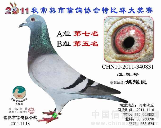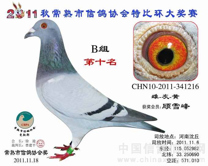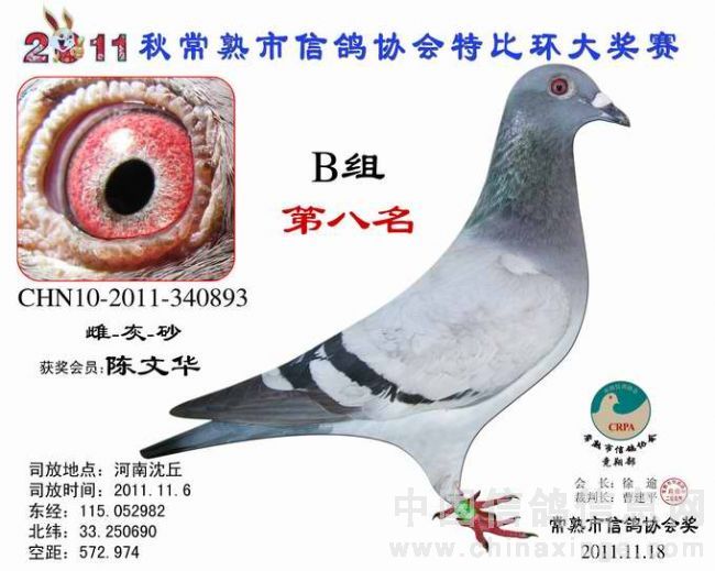 -------------------------------------------------------------------------------------------- 司放地点: 河南沈丘 司放时间: 2011-11-16 07:20:00 经纬度: 115.052982 E,33.250690 N -------------------------------------------------------------------------------------------- 名 次 鸽主姓名 棚号 足环号码 归巢时间 空距(千米) 分速(米/分) -------------------------------------------------------------------------------------------- 1 瞿雪祥 050047 2011-10-340149 2011-11-16 17:37:12 571.403 925.7755 -------------------------------------------------------------------------------------------- 2 邵停元 050002 2011-10-340103 2011-11-17 07:28:36 566.509 801.7308 -------------------------------------------------------------------------------------------- 3 徐 震 050075 2011-10-340199 2011-11-17 07:47:12 573.945 791.4161 -------------------------------------------------------------------------------------------- 4 姚宇庆 050012 2011-10-341302 2011-11-17 07:45:19 565.011 781.1302 -------------------------------------------------------------------------------------------- 5 姚耀良 050119 2011-10-340831 2011-11-17 07:43:45 563.574 780.8337 -------------------------------------------------------------------------------------------- 6 王 华 050342 2011-10-341354 2011-11-17 08:06:40 572.085 768.2357 -------------------------------------------------------------------------------------------- 7 胡利军 050314 2011-10-341447 2011-11-17 08:10:16 570.372 762.2549 -------------------------------------------------------------------------------------------- 8 陈文华 050135 2011-10-340893 2011-11-17 08:17:36 572.974 758.3027 -------------------------------------------------------------------------------------------- 9 陈文华 050135 2011-10-340889 2011-11-17 08:28:43 572.974 747.3020 -------------------------------------------------------------------------------------------- 10 顾雪峰 050385 2011-10-341216 2011-11-17 08:32:37 571.010 740.9625 -------------------------------------------------------------------------------------------- 11 彭宇明 050320 2011-10-340918 2011-11-17 08:34:50 571.980 740.1054 -------------------------------------------------------------------------------------------- 12 胡利军 050314 2011-10-341443 2011-11-17 08:36:50 570.372 736.1152 -------------------------------------------------------------------------------------------- 13 徐林元 050313 2011-10-340638 2011-11-17 08:44:21 557.703 712.8531 -------------------------------------------------------------------------------------------- 14 龚一平 050014 2011-10-341422 2011-11-17 08:39:27 553.490 711.9290 -------------------------------------------------------------------------------------------- 15 吴卫东 050117 2011-10-340747 2011-11-17 09:22:26 578.285 704.8412 -------------------------------------------------------------------------------------------- 16 彭宇明 050320 2011-10-340920 2011-11-17 09:15:56 571.980 702.7289 -------------------------------------------------------------------------------------------- 17 徐 震 050075 2011-10-340867 2011-11-17 09:24:43 573.945 697.6196 -------------------------------------------------------------------------------------------- 18 陈根华 050128 2011-10-340989 2011-11-17 09:27:35 574.762 696.1750 -------------------------------------------------------------------------------------------- 19 邵永宁 050033 2011-10-341479 2011-11-17 09:10:36 558.706 690.9455 -------------------------------------------------------------------------------------------- 20 赵忠达 050251 2011-10-340947 2011-11-17 09:22:50 565.955 689.4813 -------------------------------------------------------------------------------------------- 21 杨祝平 050187 2011-10-340985 2011-11-17 09:25:57 567.460 688.6996 -------------------------------------------------------------------------------------------- 22 邵永宁 050033 2011-10-341457 2011-11-17 09:15:48 558.706 686.5342 -------------------------------------------------------------------------------------------- 23 龚一平 050014 2011-10-341423 2011-11-17 09:15:08 553.490 680.6854 -------------------------------------------------------------------------------------------- 24 何 伟 050106 2011-10-340188 2011-11-17 10:10:41 590.885 680.1972 -------------------------------------------------------------------------------------------- 25 陆 琰 050009 2011-10-340996 2011-11-17 09:32:56 564.928 679.8583 -------------------------------------------------------------------------------------------- 26 叶玉敏 050045 2011-10-340924 2011-11-17 09:41:49 568.380 676.7843 -------------------------------------------------------------------------------------------- 27 徐谭 050098 2011-10-340192 2011-11-17 09:41:26 565.832 674.0523 -------------------------------------------------------------------------------------------- 28 张 蒙 050019 2011-10-340020 2011-11-17 09:32:14 559.577 673.9967 -------------------------------------------------------------------------------------------- 29 顾耀良 050238 2011-10-340881 2011-11-17 10:06:37 579.907 670.7079 -------------------------------------------------------------------------------------------- 30 张禹成 050181 2011-10-340053 2011-11-17 10:32:51 597.419 670.6093 -------------------------------------------------------------------------------------------- 31 陆永明 050066 2011-10-341251 2011-11-17 09:45:28 565.442 670.3779 -------------------------------------------------------------------------------------------- 32 陈文华 050135 2011-10-340890 2011-11-17 09:58:06 572.974 669.2721 -------------------------------------------------------------------------------------------- 33 陈 益 050120 2011-10-341242 2011-11-17 10:01:45 575.043 668.8454 -------------------------------------------------------------------------------------------- 34 胡利军 050314 2011-10-340210 2011-11-17 09:55:29 570.372 668.2751 ------------------------------------------------