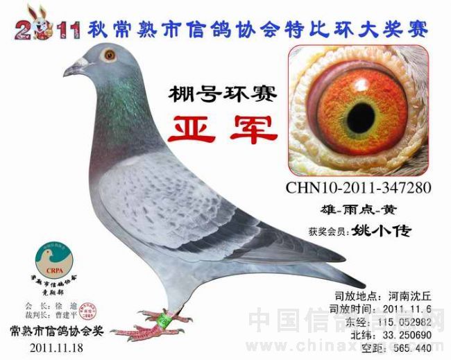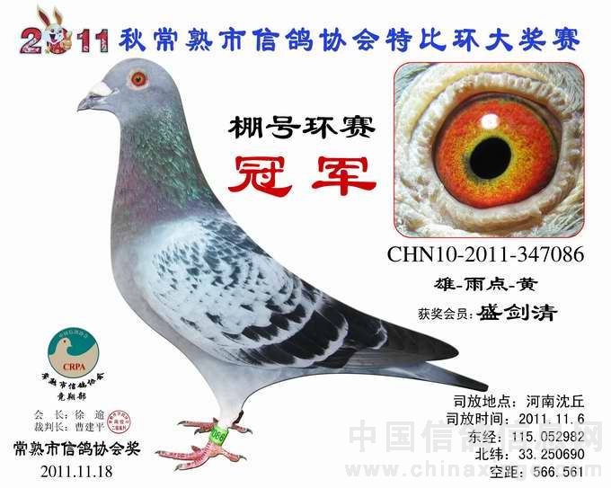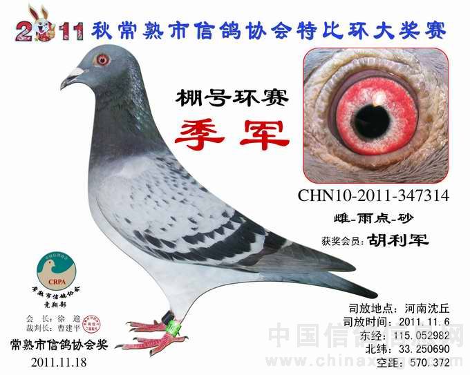 司放地点: 河南沈丘 司放时间: 2011-11-16 07:20:00 经纬度: 115.052982 E,33.250690 N -------------------------------------------------------------------------------------------- 名 次 鸽主姓名 棚号 足环号码 归巢时间 空距(千米) 分速(米/分) -------------------------------------------------------------------------------------------- 1 盛建清 050086 2011-10-347086 2011-11-17 08:08:42 566.561 758.7434 -------------------------------------------------------------------------------------------- 2 姚小传 050280 2011-10-347280 2011-11-17 08:08:59 565.440 756.9495 -------------------------------------------------------------------------------------------- 3 胡利军 050314 2011-10-347314 2011-11-17 08:27:31 570.372 745.0696 -------------------------------------------------------------------------------------------- 4 张 蒙 050019 2011-10-347019 2011-11-17 08:15:37 559.577 742.5206 -------------------------------------------------------------------------------------------- 5 王伟阳 050203 2011-10-347203 2011-11-17 08:42:05 560.648 718.6969 -------------------------------------------------------------------------------------------- 6 五星鸽苑 050024 2011-10-347024 2011-11-17 09:46:07 565.464 669.8797 -------------------------------------------------------------------------------------------- 7 许鹏飞 050282 2011-10-347282 2011-11-17 09:47:28 565.909 669.3330 -------------------------------------------------------------------------------------------- 8 杨振龙 050038 2011-10-347038 2011-11-17 09:59:51 571.581 666.2870 -------------------------------------------------------------------------------------------- 9 邵永宁 050033 2011-10-347033 2011-11-17 09:40:55 558.706 665.9749 -------------------------------------------------------------------------------------------- 10 王振叶 050362 2011-10-347362 2011-11-17 10:21:41 580.722 660.1449 -------------------------------------------------------------------------------------------- 11 李万里 050071 2011-10-347071 2011-11-17 10:23:21 572.778 649.8840 -------------------------------------------------------------------------------------------- 12 顾 荣 050233 2011-10-347233 2011-11-17 10:05:22 556.653 644.7353 -------------------------------------------------------------------------------------------- 13 金 义 050044 2011-10-347044 2011-11-17 10:29:34 568.274 640.2538 -------------------------------------------------------------------------------------------- 14 李亚洲 050237 2011-10-347237 2011-11-17 10:42:00 574.184 637.9725 -------------------------------------------------------------------------------------------- 15 万惠杰 050177 2011-10-347177 2011-11-17 10:06:01 550.882 637.5758 -------------------------------------------------------------------------------------------- 16 顾雪峰 050385 2011-10-347385 2011-11-17 10:40:27 571.010 635.5452 -------------------------------------------------------------------------------------------- 17 秦根元 050146 2011-10-347146 2011-11-17 10:33:20 565.224 634.1246 -------------------------------------------------------------------------------------------- 18 张洪声 050154 2011-10-347154 2011-11-17 10:57:30 579.446 632.9216 -------------------------------------------------------------------------------------------- 19 卢振华 050089 2011-10-347089 2011-11-17 10:51:40 568.856 625.3438 -------------------------------------------------------------------------------------------- 20 王语星 050088 2011-10-347088 2011-11-17 11:03:53 576.282 625.1092 -------------------------------------------------------------------------------------------- 21 石剑鸣 050213 2011-10-347213 2011-11-17 10:49:56 565.463 622.7943 -------------------------------------------------------------------------------------------- 22 李正平 050037 2011-10-347037 2011-11-17 10:52:16 566.435 622.2700 -------------------------------------------------------------------------------------------- 23 姚宇庆 050012 2011-10-347012 2011-11-17 10:51:00 565.011 621.5645 -------------------------------------------------------------------------------------------- 24 叶 镰 050199 2011-10-347199 2011-11-17 10:52:59 564.794 619.9797 -------------------------------------------------------------------------------------------- 25 钱建平 050164 2011-10-347164 2011-11-17 10:44:22 557.482 617.7928 -------------------------------------------------------------------------------------------- 26 徐谭 050098 2011-10-347098 2011-11-17 11:04:31 565.832 613.3501 -------------------------------------------------------------------------------------------- 27 吴建国 050099 2011-10-347099 2011-11-17 11:13:26 564.567 606.1196 -------------------------------------------------------------------------------------------- 28 徐建刚 050328 2011-10-347328 2011-11-17 11:03:17 555.979 603.4803 -------------------------------------------------------------------------------------------- 29 陶祖兴 050043 2011-10-347043 2011-11-17 11:20:46 566.199 603.1205 -------------------------------------------------------------------------------------------- 30 日新鸽舍 050338 2011-10-347338 2011-11-17 11:35:32 573.394 601.3265 -------------------------------------------------------------------------------------------- 31 陆培军 050373 2011-10-347373 2011-11-17 11:41:48 574.861 598.9379 -------------------------------------------------------------------------------------------- 32 钱 明 050243 2011-10-347243 2011-11-17 11:31:02 564.719 595.0374 -------------------------------------------------------------------------------------------- 33 王 勇 050084 2011-10-347084 2011-11-17 11:53:30 565.318 581.8926 -------------------------------------------------------------------------------------------- 34 Tiger鸽舍 050111 2011-10-347111 2011-11-17 11:54:15 565.195 581.3252 -------------------------------------------------------------------------------------------- 35 余兴中 050010 2011-10-347010 201