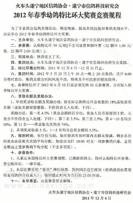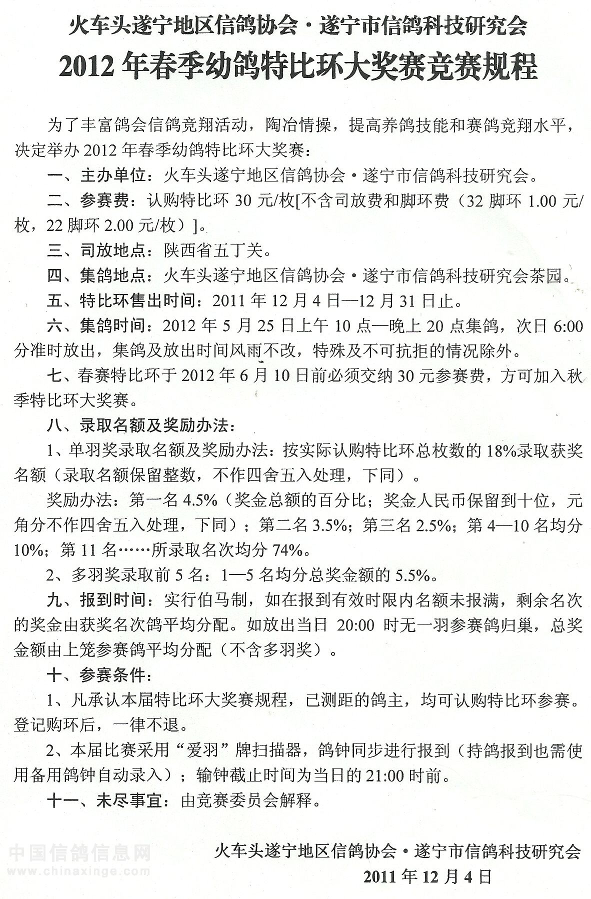 2012年春季幼鸽特比环大奖赛竞赛规程