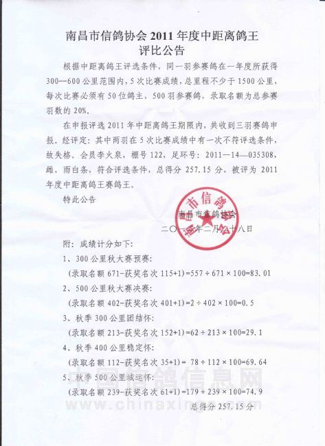 南昌市信鸽协会2011年度中距离鸽王评比公告