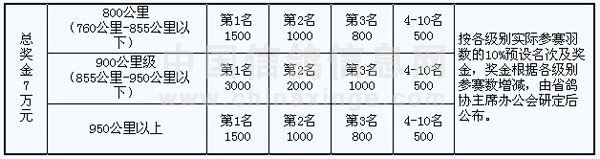2、500公里普赛:冠军1500元、亚军1000元、季军500元、4—10名各200元11—20名100元、21名—60名各60元;前10名奖杯各一座!总奖金7800元!