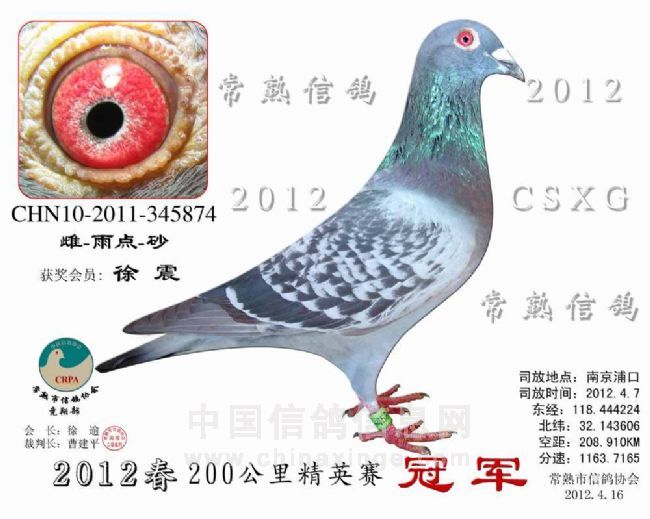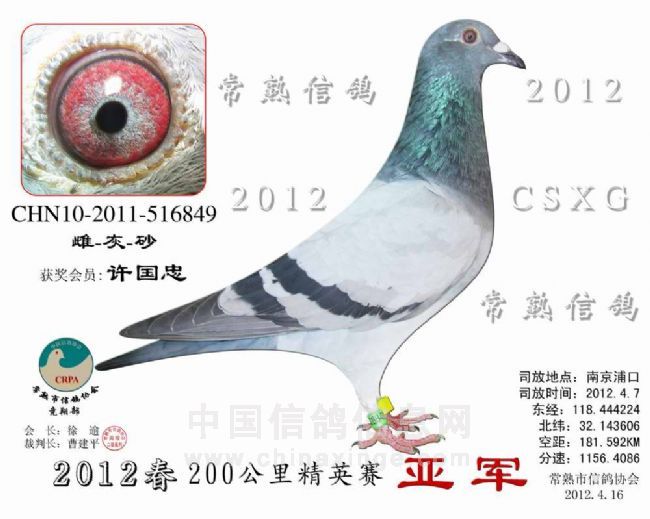 浦口精英赛 安捷赛鸽实时显示系统 -------------------------------------------------------------------------------------------- 司放地点: 浦口精英赛 司放时间: 2012-04-07 06:15:00 经纬度: 118.444224 E,32.143606 N -------------------------------------------------------------------------------------------- 名 次 鸽主姓名 棚号 足环号码 归巢时间 空距(千米) 分速(米/分) -------------------------------------------------------------------------------------------- 1 徐 震 050075 2011-10-345874 2012-04-07 09:14:31 208.910 1,163.7165 -------------------------------------------------------------------------------------------- 2 许国忠 050055 2011-10-516849 2012-04-07 08:52:01 181.592 1,156.4086 -------------------------------------------------------------------------------------------- 3 徐 震 050075 2011-32-081570 2012-04-07 09:17:30 208.910 1,144.6371 -------------------------------------------------------------------------------------------- 4 徐 震 050075 2011-10-523815 2012-04-07 09:17:31 208.910 1,144.5106 -------------------------------------------------------------------------------------------- 5 李万里 050071 2011-10-345200 2012-04-07 09:17:26 207.763 1,138.7997 -------------------------------------------------------------------------------------------- 6 黄 强 050068 2011-32-076481 2012-04-07 09:19:22 208.846 1,132.7466 -------------------------------------------------------------------------------------------- 7 钱维国 050287 2011-10-345766 2012-04-07 09:19:37 209.000 1,131.9845 -------------------------------------------------------------------------------------------- 8 徐 震 050075 2011-32-081571 2012-04-07 09:19:33 208.910 1,131.9129 -------------------------------------------------------------------------------------------- 9 瞿雪祥 050047 2011-10-515691 2012-04-07 09:17:10 205.936 1,130.3789 -------------------------------------------------------------------------------------------- 10 汤志平 050263 2011-10-515981 2012-04-07 09:14:13 201.893 1,126.4423 -------------------------------------------------------------------------------------------- 11 朱 慧 050016 2011-32-082716 2012-04-07 09:13:33 201.130 1,126.4053 -------------------------------------------------------------------------------------------- 12 汤志平 050263 2010-10-508594 2012-04-07 09:14:42 201.893 1,123.4711 -------------------------------------------------------------------------------------------- 13 严建宏 050127 2011-10-516107 2012-04-07 09:19:56 207.689 1,122.9720 -------------------------------------------------------------------------------------------- 14 何 伟 050106 2011-10-335497 2012-04-07 09:35:56 225.631 1,122.8570 -------------------------------------------------------------------------------------------- 15 金澜轩鸽 050299 2011-32-082355 2012-04-07 09:12:16 199.022 1,122.7160 -------------------------------------------------------------------------------------------- 16 何 伟 050106 2011-32-171331 2012-04-07 09:36:02 225.631 1,122.3348 -------------------------------------------------------------------------------------------- 17 徐 逾 050001 2011-32-076159 2012-04-07 09:21:08 208.350 1,119.3358 -------------------------------------------------------------------------------------------- 18 徐 震 050075 2010-10-509415 2012-04-07 09:21:40 208.910 1,119.0698 -------------------------------------------------------------------------------------------- 19 瞿雪祥 050047 2011-10-341323 2012-04-07 09:19:06 205.936 1,118.5173 -------------------------------------------------------------------------------------------- 20 徐 逾 050001 2011-10-519000 2012-04-07 09:21:40 208.350 1,116.1597 -------------------------------------------------------------------------------------------- 21 袁涛 050085 2010-10-527164 2012-04-07 09:06:18 191.166 1,115.8851 -------------------------------------------------------------------------------------------- 22 许国忠 050055 2011-10-516855 2012-04-07 08:57:52 181.592 1,114.9152 -------------------------------------------------------------------------------------------- 23 瞿雪祥 050047 2011-32-076470 2012-04-07 09:19:59 205.936 1,113.2007 -------------------------------------------------------------------------------------------- 24 许国忠 050055 2011-10-516383 2012-04-07 08:58:09 181.592 1,113.0121 -------------------------------------------------------------------------------------------- 25 许国忠 050055 2011-10-516898 2012-04-07 08:58:13 181.592 1,112.5734 -------------------------------------------------------------------------------------------- 26 汤志平 050263 2011-10-515980 2012-04-07 09:16:45 201.893 1,110.7812 -------------------------------------------------------------------------------------------- 27 瞿雪祥 050047 2011-32-076467 2012-04-07 09:20:28 205.936 1,110.3207 -------------------------------------------------------------------------------------------- 28 徐 逾 050001 2011-10-518961 2012-04-07 09:22:42 208.350 1,109.9529 -------------------------------------------------------------------------------------------- 29 姚宇庆 050012 2011-10-515729 2012-04-07 09:14:44 199.314 1,108.8802 -------------------------------------------------------------------------------------------- 30 王力勇 050035 2011-10-343285 2012-04-07 09:14:47 198.967 1,106.6233 -------------------------------------------------------------------------------------------- 31 汪雪龙 050096 2009-32-171448 2012-04-07 09:28:45 214.080 1,104.8663 -------------------------------------------------------------------------------------------- 32 瞿雪祥 050047 2011-32-081525 2012-04-07 09:21:41 205.936 1,103.0680 -------------------------------------------------------------------------------------------- 33 瞿雪祥 050047 2011-10-516033 2012-04-07 09:21:43 205.936 1,102.8514 -------------------------------------------------------------------------------------------- 34 钱利