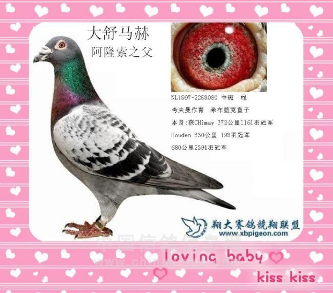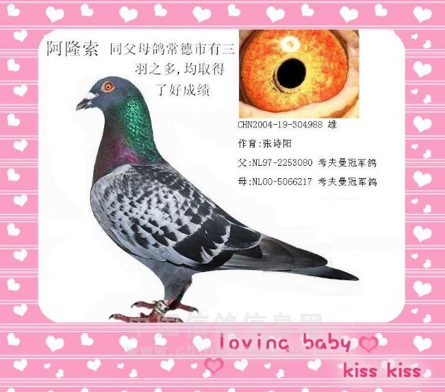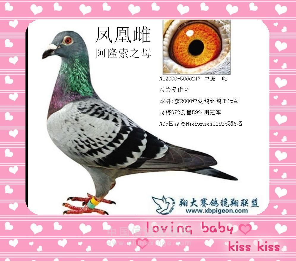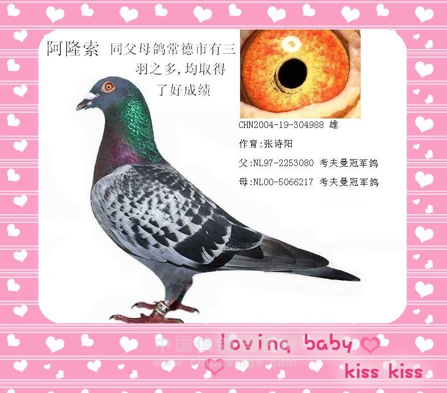 湖南名鸽"阿隆索",是荷兰名家考夫曼血统,由翔大赛鸽竞翔联盟老总张诗阳作育,袁震东引进。后代引入邵阳后,创造了很好赛绩,300公里,500公里以及幼鸽赛均有多羽高位入赏,此鸽现已被长沙酷鸽网潘总收藏,"阿隆索"同父母兄弟常德市还有三羽之多,后代均创造了不俗的赛绩。