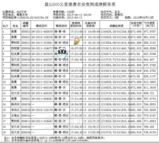 辽宁盘锦市盘山县信鸽协会500公里成绩