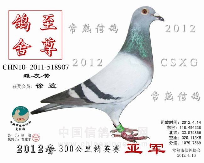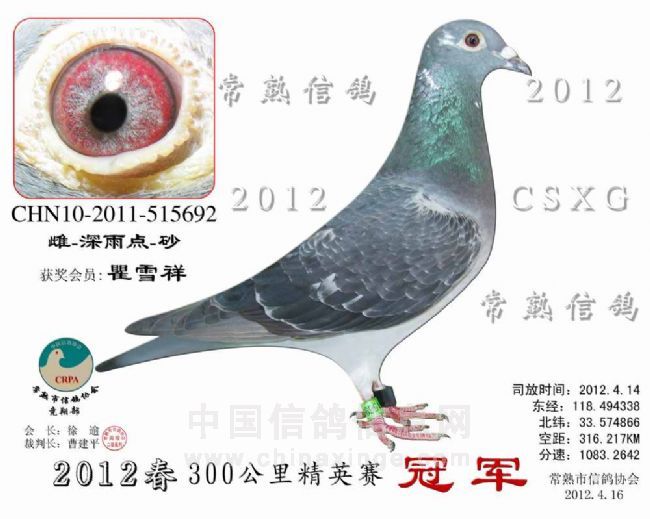 300公里指定鸽赛 安捷赛鸽实时显示系统 -------------------------------------------------------------------------------------------- 司放地点: 300公里精英赛 司放时间: 2012-04-14 07:00:00 经纬度: 118.494338 E,33.574866 N -------------------------------------------------------------------------------------------- 名 次 鸽主姓名 棚号 足环号码 归巢时间 空距(千米) 分速(米/分) -------------------------------------------------------------------------------------------- 1 瞿雪祥 050047 2011-10-515692 2012-04-14 11:51:54 316.217 1,083.2642 -------------------------------------------------------------------------------------------- 2 徐 逾 050001 2011-10-518907 2012-04-14 11:56:28 320.113 1,079.7569 -------------------------------------------------------------------------------------------- 3 徐 逾 050001 2011-32-076159 2012-04-14 11:56:41 320.113 1,078.9465 -------------------------------------------------------------------------------------------- 4 徐 逾 050001 2011-10-518992 2012-04-14 11:58:04 320.113 1,073.9182 -------------------------------------------------------------------------------------------- 5 陶卓越 050027 2011-32-076173 2012-04-14 11:54:04 313.842 1,067.2359 -------------------------------------------------------------------------------------------- 6 汤志平 050263 2011-10-515861 2012-04-14 11:54:50 314.038 1,065.1277 -------------------------------------------------------------------------------------------- 7 石剑鸣 050213 2011-10-341359 2012-04-14 11:52:41 311.673 1,064.8722 -------------------------------------------------------------------------------------------- 8 李万里 050071 2011-10-516252 2012-04-14 11:54:01 313.012 1,064.5749 -------------------------------------------------------------------------------------------- 9 徐 逾 050001 2011-10-518916 2012-04-14 12:00:44 320.113 1,064.4048 -------------------------------------------------------------------------------------------- 10 枫林鸽舍 050226 2010-10-506488 2012-04-14 11:53:22 312.009 1,063.4864 -------------------------------------------------------------------------------------------- 11 李万里 050071 2011-10-515642 2012-04-14 11:54:20 313.012 1,063.4049 -------------------------------------------------------------------------------------------- 12 徐 震 050075 2011-10-515641 2012-04-14 11:55:33 314.134 1,062.8740 -------------------------------------------------------------------------------------------- 13 汤志平 050263 2010-10-509803 2012-04-14 11:55:40 314.038 1,062.1065 -------------------------------------------------------------------------------------------- 14 许国忠 050055 2011-10-516898 2012-04-14 11:34:57 290.828 1,057.7397 -------------------------------------------------------------------------------------------- 15 瞿雪祥 050047 2011-32-076470 2012-04-14 12:02:19 316.217 1,045.9417 -------------------------------------------------------------------------------------------- 16 袁涛 050085 2010-10-527164 2012-04-14 11:44:25 296.812 1,043.5498 -------------------------------------------------------------------------------------------- 17 胡利军 050314 2011-32-076737 2012-04-14 12:02:18 315.174 1,042.5432 -------------------------------------------------------------------------------------------- 18 王伟阳 050203 2011-10-345011 2012-04-14 11:48:28 300.031 1,040.0613 -------------------------------------------------------------------------------------------- 19 邵 佳 050400 2011-10-516070 2012-04-14 12:07:57 319.774 1,038.3464 -------------------------------------------------------------------------------------------- 20 邵 佳 050400 2011-32-076479 2012-04-14 12:09:01 319.774 1,034.7914 -------------------------------------------------------------------------------------------- 21 李亚洲 050237 2011-10-516102 2012-04-14 12:04:26 314.437 1,032.8204 -------------------------------------------------------------------------------------------- 22 徐 逾 050001 2011-10-518908 2012-04-14 12:10:12 320.113 1,031.9180 -------------------------------------------------------------------------------------------- 23 陈根华 050128 2011-10-516008 2012-04-14 12:10:10 319.946 1,031.5143 -------------------------------------------------------------------------------------------- 24 徐吉宏 050268 2011-32-076550 2012-04-14 12:06:06 315.287 1,029.9598 -------------------------------------------------------------------------------------------- 25 胡杰 050129 2011-10-341158 2012-04-14 12:12:21 319.733 1,023.6271 -------------------------------------------------------------------------------------------- 26 钱建平 050164 2011-10-346098 2012-04-14 11:57:57 304.452 1,021.7773 -------------------------------------------------------------------------------------------- 27 徐 震 050075 2011-10-515774 2012-04-14 12:08:00 314.134 1,019.9034 -------------------------------------------------------------------------------------------- 28 王振华 050350 2011-10-343201 2012-04-14 12:08:47 314.350 1,017.9893 -------------------------------------------------------------------------------------------- 29 许国忠 050055 2011-10-516389 2012-04-14 11:46:12 290.828 1,016.1581 -------------------------------------------------------------------------------------------- 30 徐 逾 050001 2011-10-518996 2012-04-14 12:15:02 320.113 1,016.0753 -------------------------------------------------------------------------------------------- 31 袁涛 050085 2010-10-527010 2012-04-14 11:52:23 296.812 1,015.1404 -------------------------------------------------------------------------------------------- 32 瞿雪祥 050047 2011-10-516206 2012-04-14 12:11:54 316.217 1,013.8099 -------------------------------------------------------------------------------------------- 33 徐 震 050075 2011-32-076544 2012-04-14 12:12:02 314.134 1,006.7048 -------------------------------------------------------------------------------------------- 34 徐