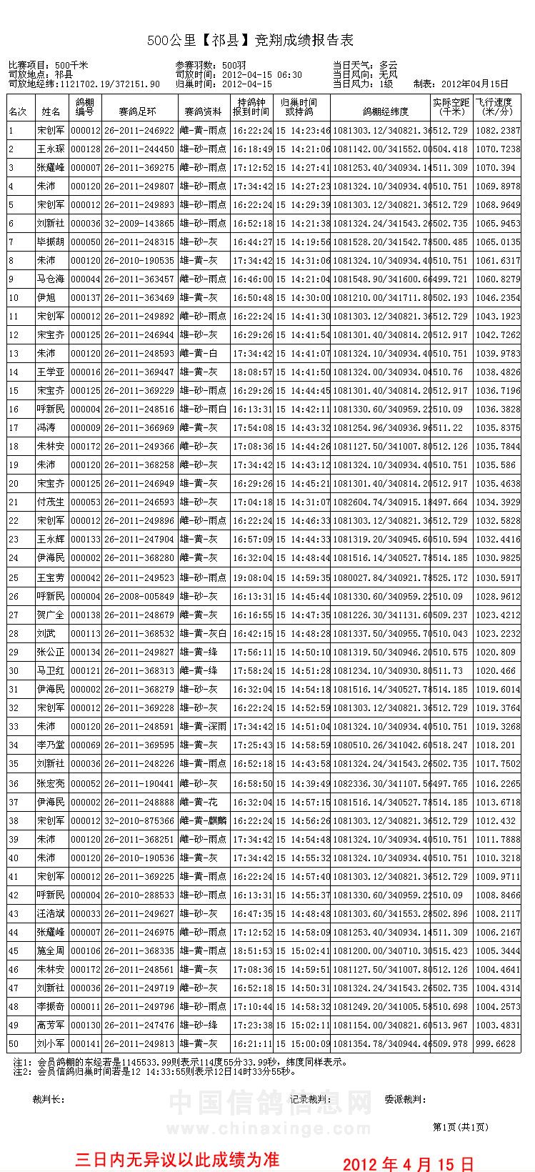 500公里普赛成绩