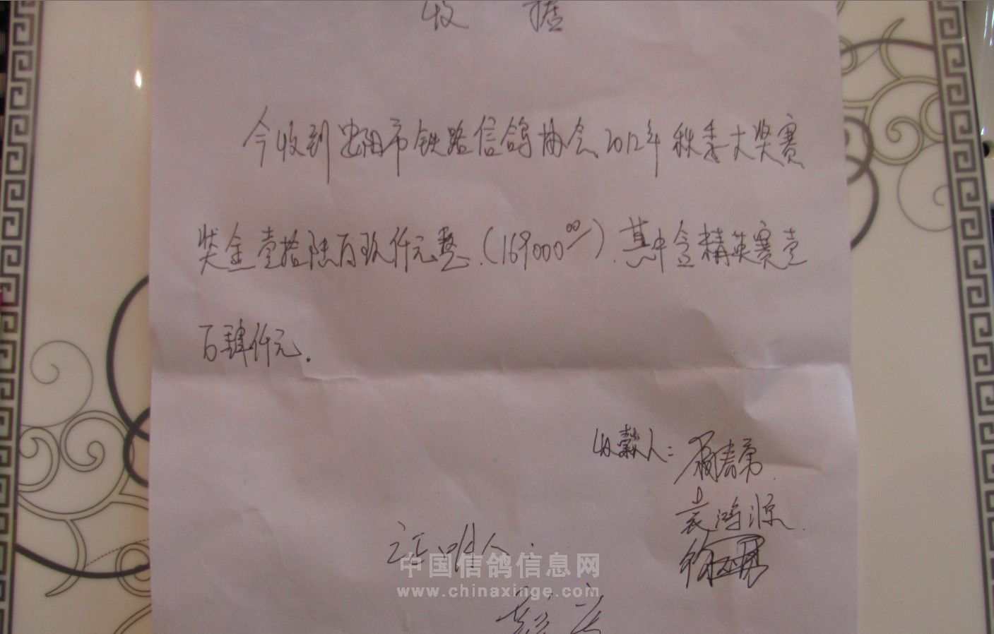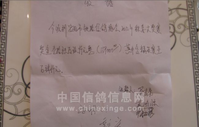 安阳铁路信鸽协会为保证鸽友利益,已将2012年秋季“铁鹰杯”大奖赛奖金15.5万和金手指赛14000元(共计:169000元)委托会员魏宏、杨春勇、袁鸿源、李培杰四位先生联名存入银行。(杨春勇存款户名,袁鸿源存款密码,魏宏存单保管),希望鸽会会员放心赢取大奖赛各项奖金。