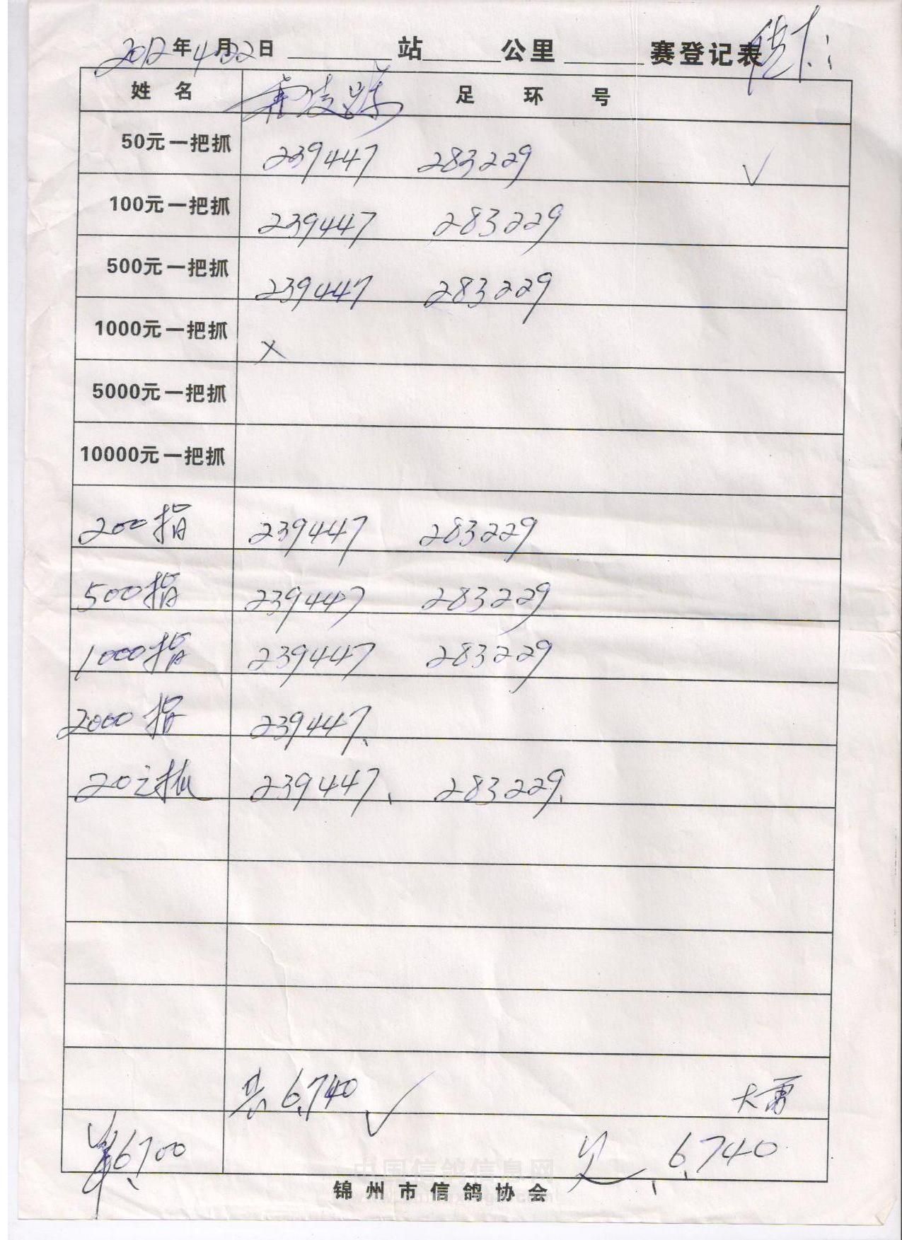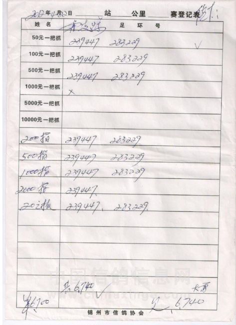一:霍凌辉参赛单说明:因当晚集鸽时霍先生填写的参赛单没有扫描上,在第二天早上接到霍先生打来的电话请求传网上公示扫描,当时我本人正在单位开会没有仔细审核参赛单,只是按照足环号239447+283229号一同复制到各个参赛项目里,在参赛栏里霍先生只指定2000元一羽环号为239447,我错误的传上239447+283229造成公示有误,这是我本人的失职,此次失误还要敬请鸽友们的谅解。详见霍先生参赛登记表。
