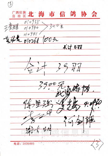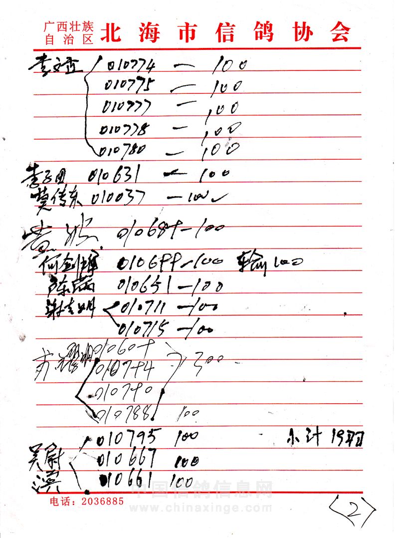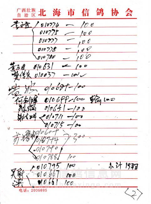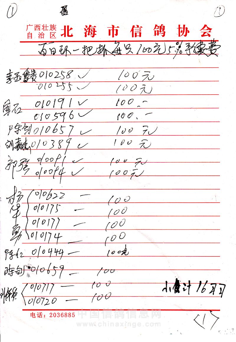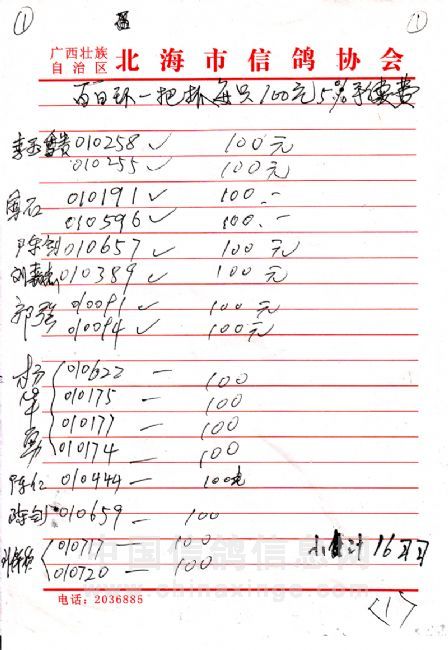 广西北海市信鸽协会2012上半年百日赛100元组指定鸽名单