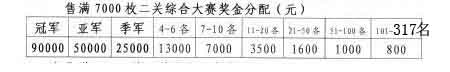 在协会和会员共同努力下,2012年秋季大奖赛特比环售出7170枚,号段为020001-027000,036331-036500。奖金分配如下表: