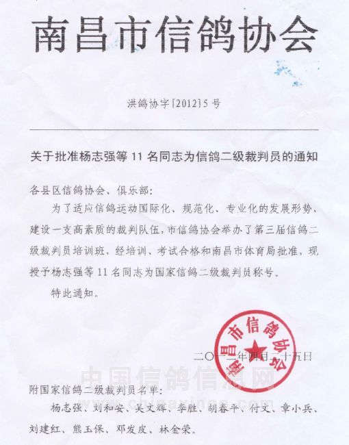 关于批准杨志强等等11名同志为信鸽二级裁判员的通知