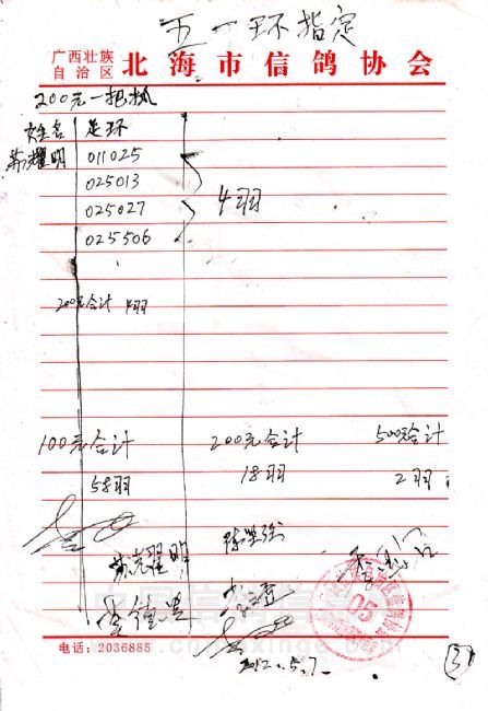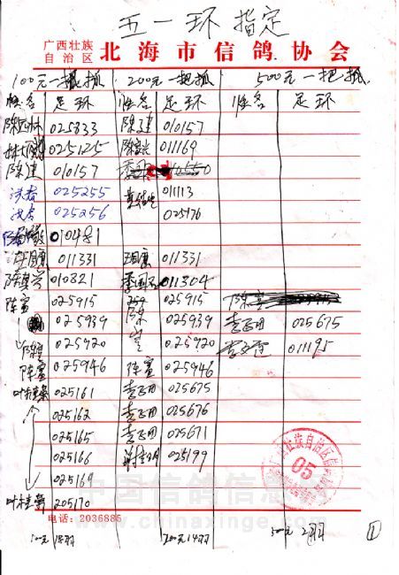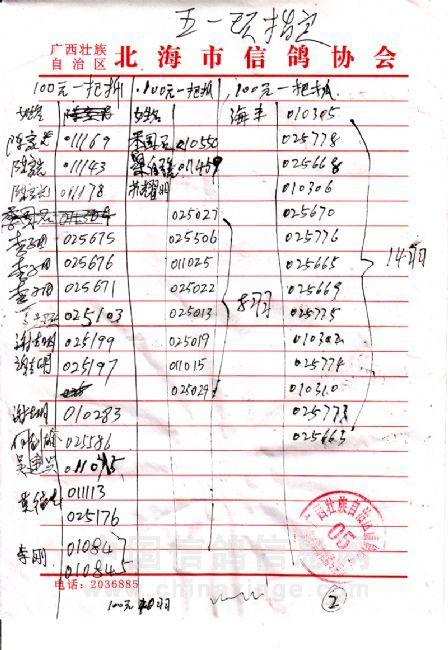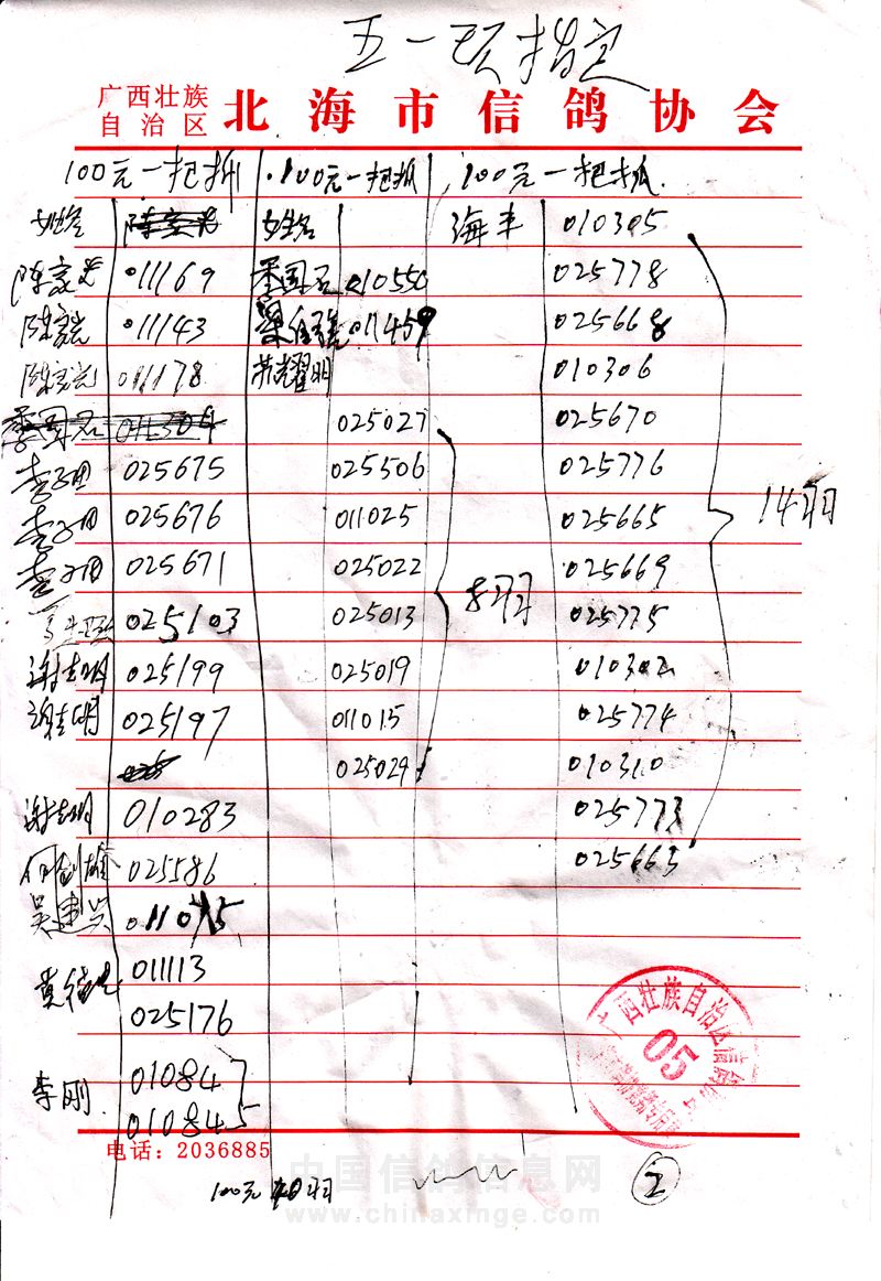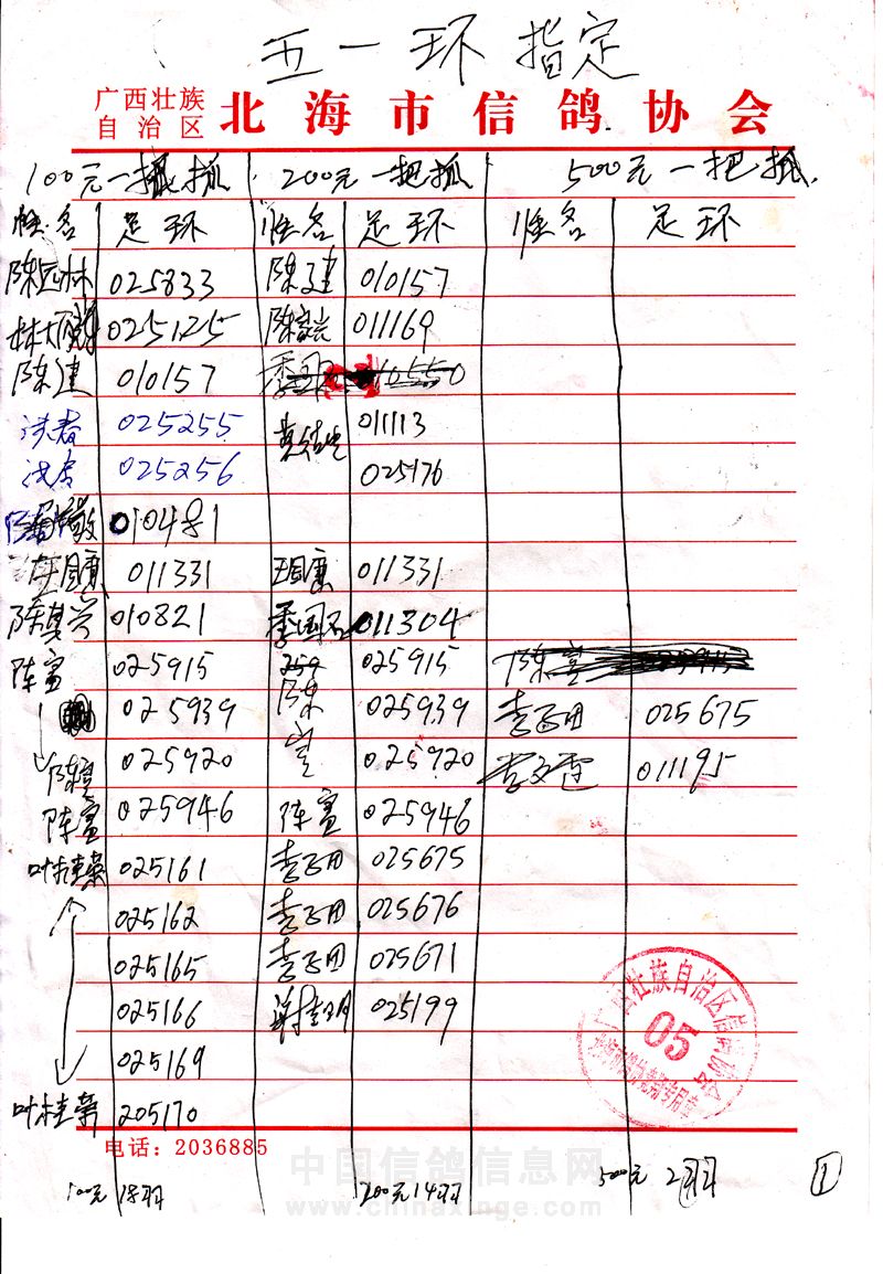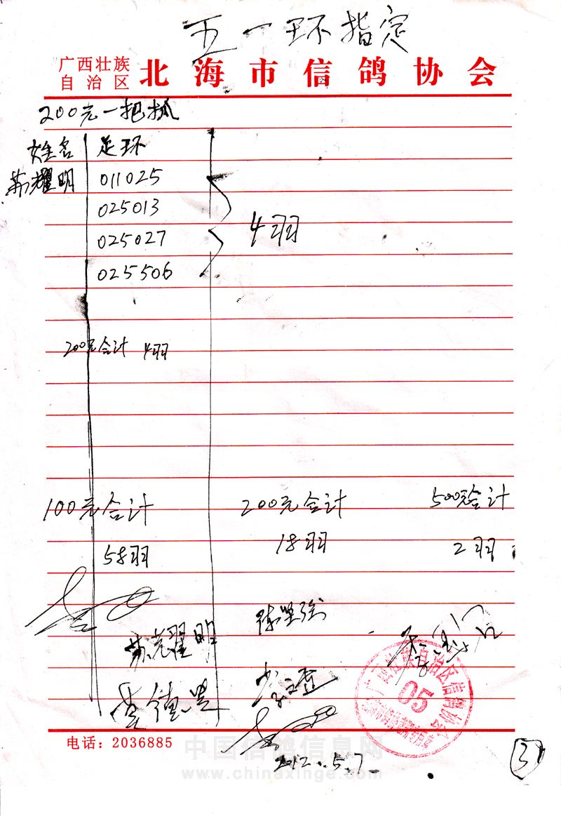 2012年广西北海信鸽协会上半年东莞站指定鸽名单