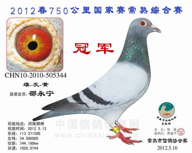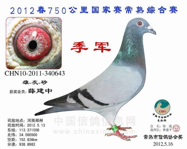 750郑州国家赛常熟成绩 安捷赛鸽实时显示系统 -------------------------------------------------------------------------------------------- 司放地点: 750公里郑州国家赛 司放时间: 2012-05-13 06:00:00 经纬度: 113.371500 E,34.500500 N -------------------------------------------------------------------------------------------- 名 次 鸽主姓名 棚号 足环号码 归巢时间 空距(千米) 分速(米/分) -------------------------------------------------------------------------------------------- 1 邵永宁 050033 2010-10-505344 2012-05-13 18:03:52 744.190 1,028.0744 -------------------------------------------------------------------------------------------- 2 汤志平 050263 2010-10-509803 2012-05-13 18:42:59 752.951 986.8454 -------------------------------------------------------------------------------------------- 3 薛建中 050015 2011-10-340643 2012-05-13 19:32:18 752.836 938.6983 -------------------------------------------------------------------------------------------- 4 钱友明 050136 2011-10-346046 2012-05-14 06:18:03 742.694 826.0803 -------------------------------------------------------------------------------------------- 5 徐学明 050169 2010-10-525896 2012-05-14 07:02:00 732.669 776.9545 -------------------------------------------------------------------------------------------- 6 徐志江 050079 2011-10-347619 2012-05-14 07:34:16 754.575 773.7009 -------------------------------------------------------------------------------------------- 7 陆忠文 050235 2010-10-525080 2012-05-14 08:21:35 750.895 734.3049 -------------------------------------------------------------------------------------------- 8 徐谭 050098 2011-10-346560 2012-05-14 10:01:04 751.303 669.5663 -------------------------------------------------------------------------------------------- 9 谢建础 050260 2010-10-507323 2012-05-14 10:15:12 752.567 662.3508 -------------------------------------------------------------------------------------------- 10 何顺祥 050180 2010-10-525584 2012-05-14 10:15:25 751.722 661.4751 -------------------------------------------------------------------------------------------- 11 钱维国 050287 2009-10-261017 2012-05-14 10:28:29 759.912 661.0819 -------------------------------------------------------------------------------------------- 12 徐学明 050169 2011-10-343905 2012-05-14 09:53:39 732.669 657.3049 -------------------------------------------------------------------------------------------- 13 施建达 050113 2010-10-525806 2012-05-14 09:50:42 727.952 654.8085 -------------------------------------------------------------------------------------------- 14 王伟阳 050203 2011-10-345014 2012-05-14 10:22:06 744.024 650.8802 -------------------------------------------------------------------------------------------- 15 尹建平 050123 2011-10-343833 2012-05-14 09:59:37 728.624 650.1966 -------------------------------------------------------------------------------------------- 16 陶冶 050126 2011-10-336821 2012-05-14 09:56:43 725.365 648.9696 -------------------------------------------------------------------------------------------- 17 周继东 050330 2011-10-347811 2012-05-14 10:31:10 747.153 648.4755 -------------------------------------------------------------------------------------------- 18 薛建中 050015 2011-10-342890 2012-05-14 10:47:48 752.836 644.1045 -------------------------------------------------------------------------------------------- 19 钱友明 050136 2011-10-346045 2012-05-14 10:36:02 742.694 641.8893 -------------------------------------------------------------------------------------------- 20 徐学明 050169 2010-10-525900 2012-05-14 10:25:27 732.669 639.0716 -------------------------------------------------------------------------------------------- 21 戈国平 050383 2011-10-342485 2012-05-14 10:47:41 745.268 637.6951 -------------------------------------------------------------------------------------------- 22 薛建中 050015 2011-10-341554 2012-05-14 11:12:22 752.836 630.8494 -------------------------------------------------------------------------------------------- 23 汤志平 050263 2010-10-508594 2012-05-14 11:12:48 752.951 630.7110 -------------------------------------------------------------------------------------------- 24 俞天钢 050006 2011-32-076169 2012-05-14 11:25:20 753.635 624.7274 -------------------------------------------------------------------------------------------- 25 钱建平 050164 2011-10-346126 2012-05-14 11:12:57 742.753 622.0913 -------------------------------------------------------------------------------------------- 26 周伟国 050188 2011-10-341277 2012-05-14 11:29:42 751.073 620.3572 -------------------------------------------------------------------------------------------- 27 杨祝平 050187 2010-10-522737 2012-05-14 11:41:08 753.037 616.1585 -------------------------------------------------------------------------------------------- 28 李根宝 050072 2011-10-346769 2012-05-14 11:45:49 752.945 613.7307 -------------------------------------------------------------------------------------------- 29 顾 宇 050137 2011-10-346019 2012-05-14 11:46:41 751.339 611.9939 -------------------------------------------------------------------------------------------- 30 杨友良 050025 2010-10-505938 2012-05-14 12:10:50 765.529 611.5240 -------------------------------------------------------------------------------------------- 31 何顺祥 050180 2010-10-525588 2012-05-14 11:49:52 751.722 610.7235 -------------------------------------------------------------------------------------------- 32 周 俊 050333 2010-10-506788 2012-05-14 11:51:41 748.274 607.0266 -------------------------------------------------------------------------------------------- 33 钱友明 050136 2011-10-346050 2012-05-14 11:47:50 742.694 604.3873 -------------------------------------------------------------------------------------------- 34 陆虎保 050327 2011-10-343036 20
