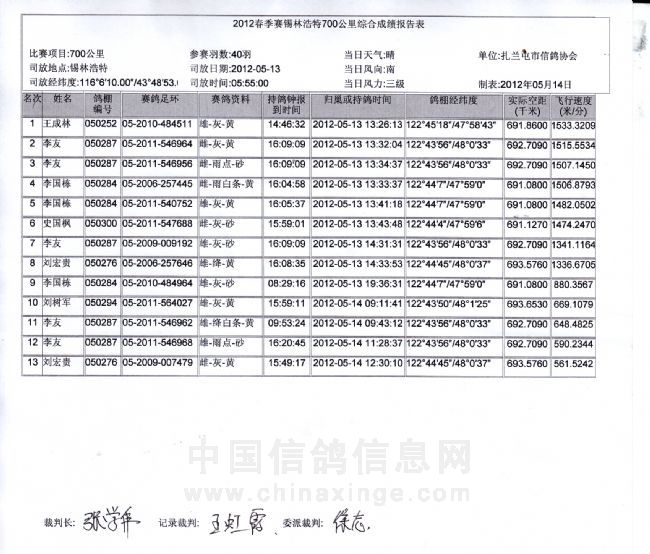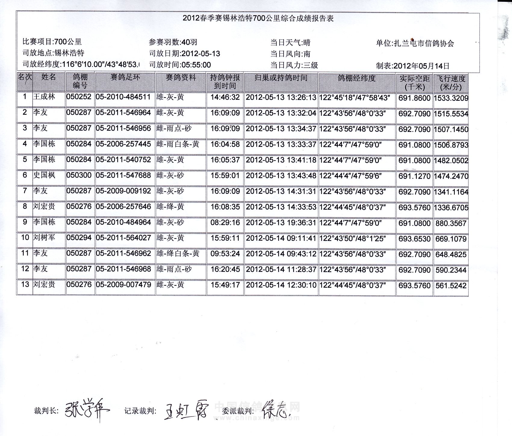 扎兰屯市信鸽协会2012年700公里春赛成绩单