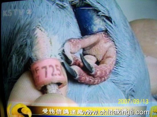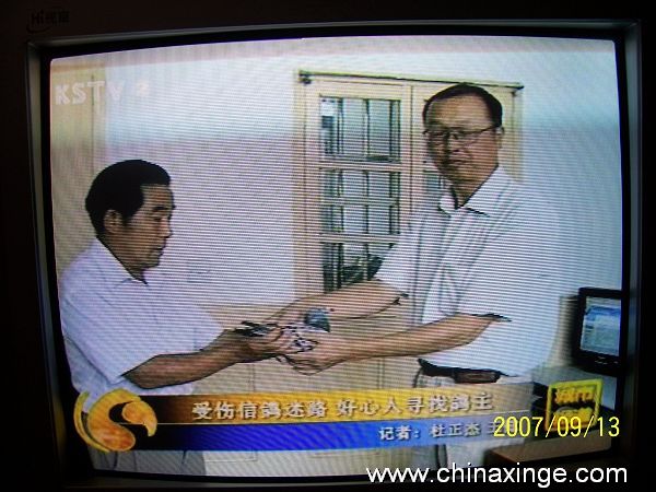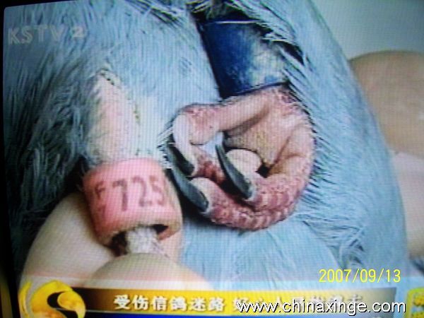 为此,电视台《昆视新闻》摄制组专门拍录了交送伤鸽的全过程,并在电视新闻中播出,相信一定会更好推动昆山市民树立“爱鸽护鸽”的良好风气。冲着何厂长关爱信鸽的一份热情,我们鸽协不能辜负社会的期望,完全有责任帮助它找家!经我们初步查看判别,该鸽外血成份居多,可能是一羽公棚赛鸽或台湾赛鸽,雨点、砂眼、雌、翅膀两侧各有一个大大的滚章,右侧为红色,左侧蓝色,足环号:TFPF2007-725658 希望鸽主得悉后,与我们联系,电话:57327979 50629948