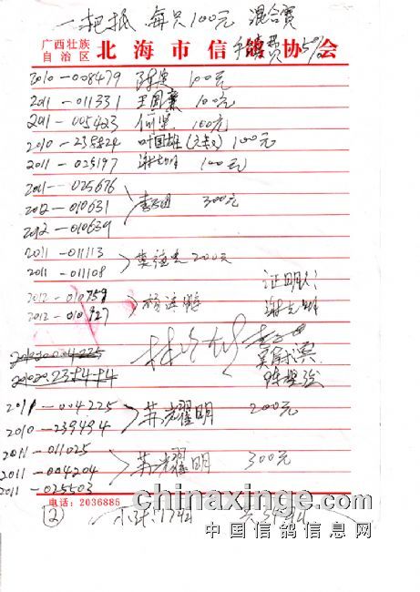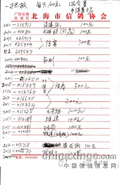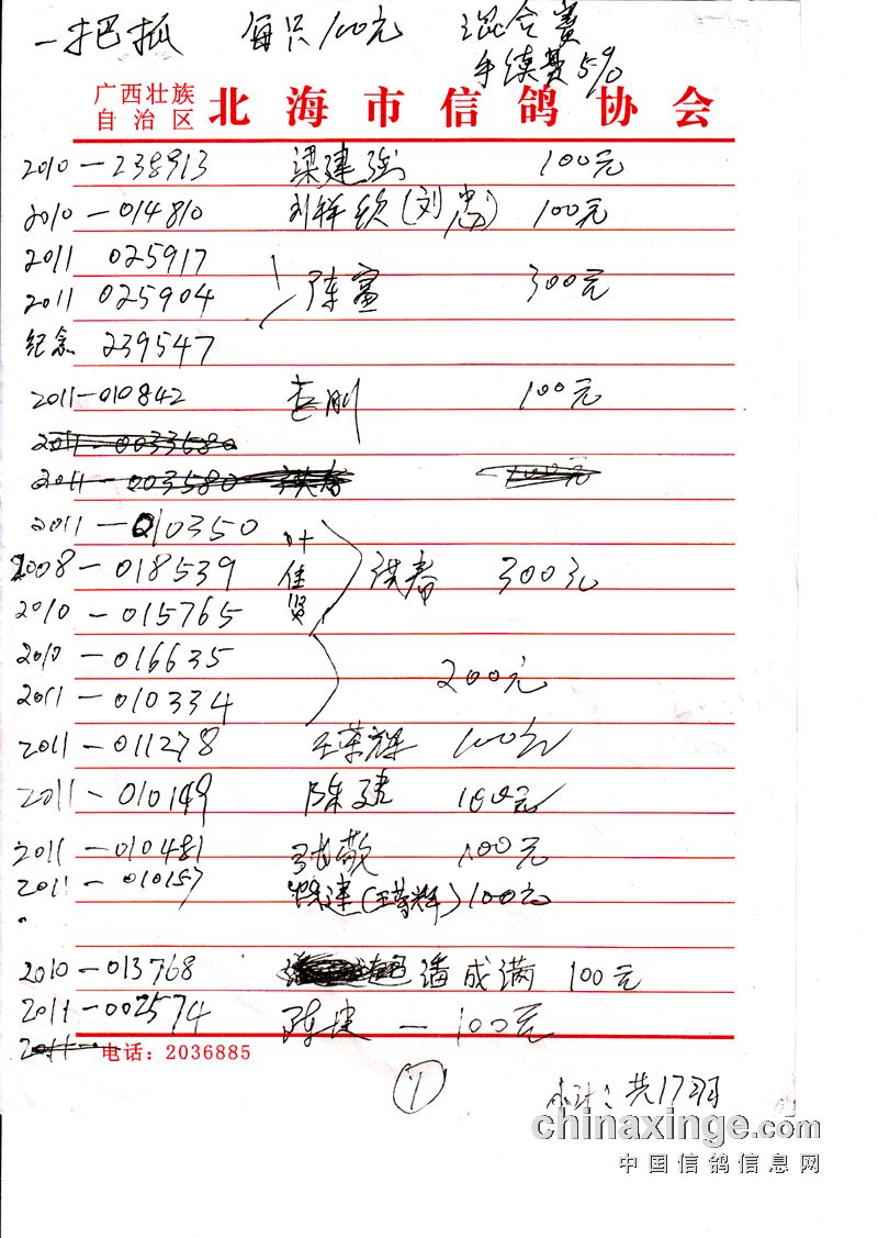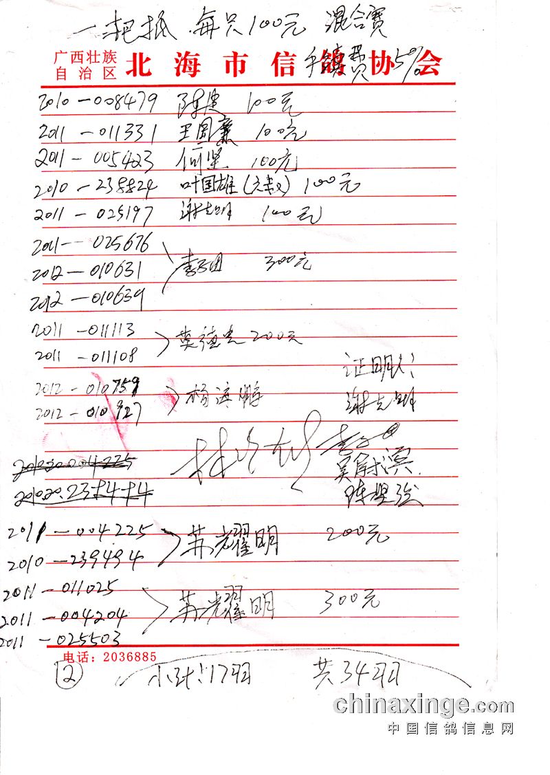 广西北海信鸽协会2012年上半年三关赛第三关100元组指定鸽名单