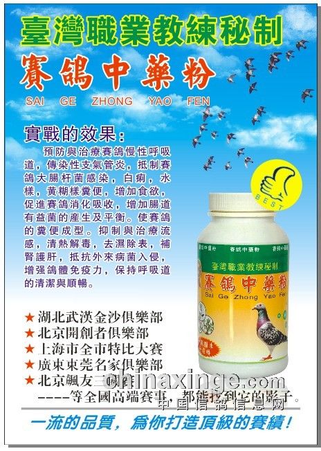 一个星期后你会发现赛鸽发生了惊人的改变:食欲大增,比平时多吃一到三成。口腔非常清洁,绿便,水便,白痢,水节便全部消失,饲料消化情况很好,全部拉成成型的田螺样粪便。效果完全可以自行判断!!使用此方案决赛前10天不需作呼吸道清理。