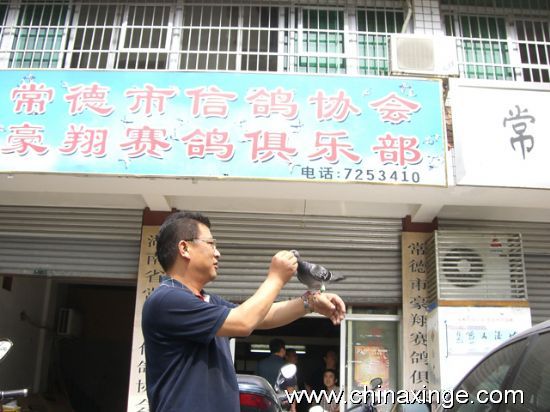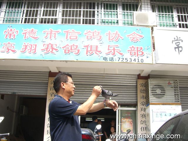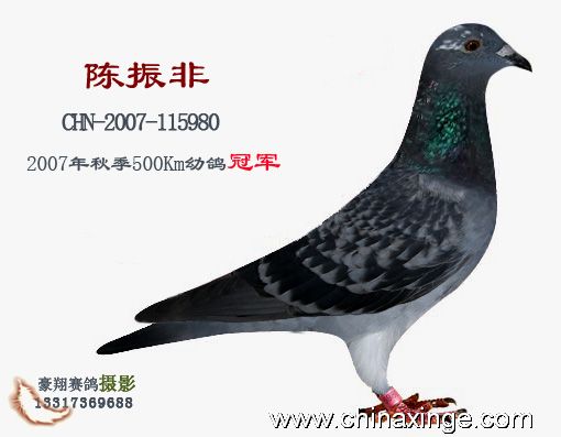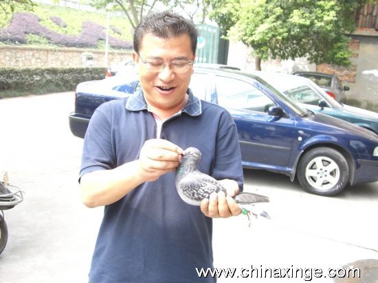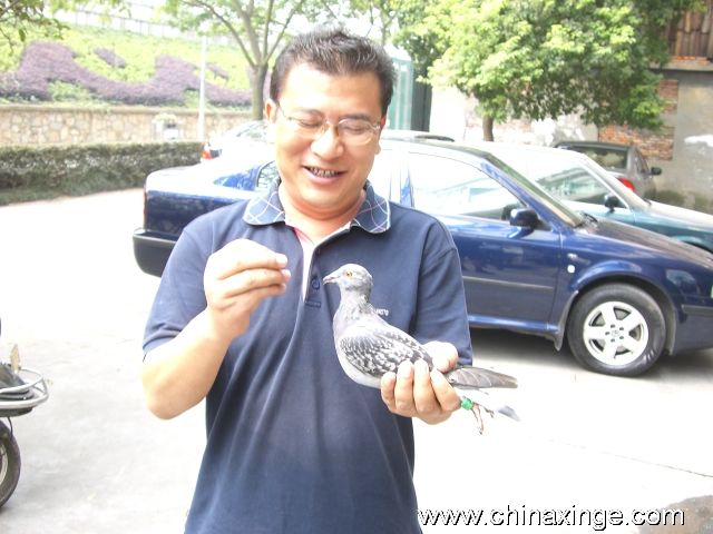10月6-7日,正是2007年秋季省联翔500km比赛正酣的日子.由于天气的原因,比赛当天没有到鸽,7号清晨7:05分,会员丁冬新的一羽赛鸽(2006-18-065730 )进棚报到,摘走了普赛的冠军,同时也拉开了赛鸽大面积归巢的序幕.8:13分,鸽会副主席陈振非的一羽幼鸽进棚报到,幼鸽冠军也就此产生.约11点多钟,陈振非副主席将他的幼鸽冠军带到了鸽会,看上去很平常的一羽雌性雨点幼鸽,却有着高贵的血统和良好的亲和力.这羽幼鸽的父亲是2006年南非太阳城百万美元大赛的第243名,是那种有速度、有耐力和良好导航能力的赛鸽,而她和主人的亲和力,则可在亲和力前面加上"超强"二字.百闻不如一见,大家还是随照相机的胶卷来欣赏她的飒爽英姿吧!!