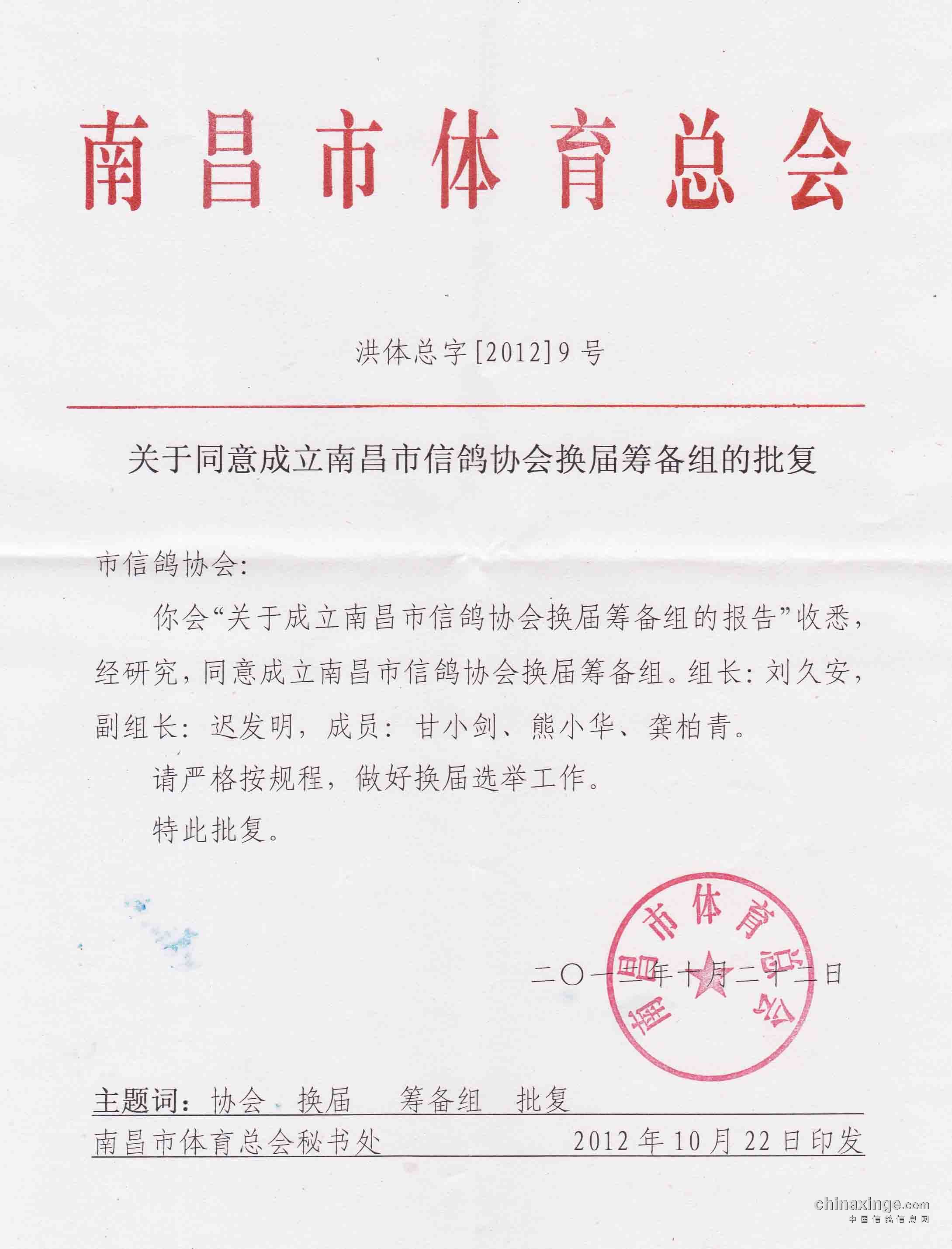 南昌市体总关于同意成立南昌市信鸽协会换届筹备小组的批复