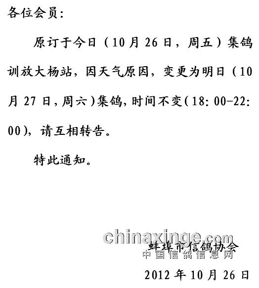 蚌埠市信鸽协会关于700公里廊坊站集鸽的通知
