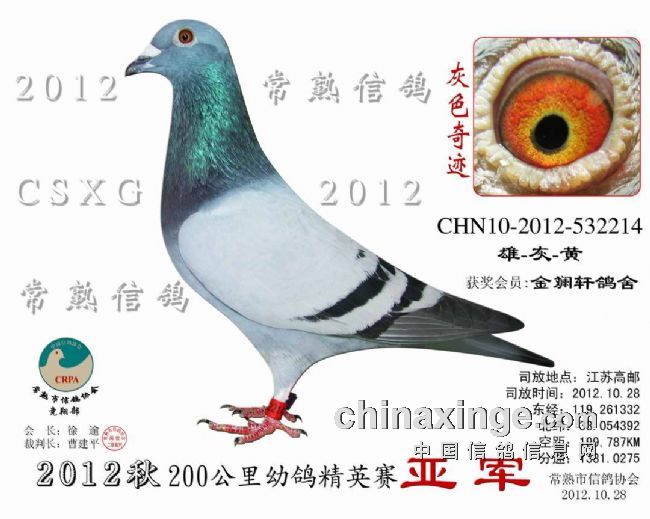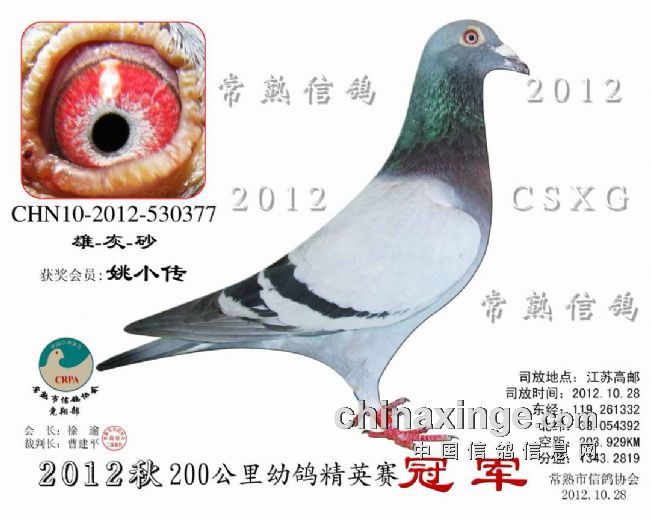 2012秋200公里精英赛 安捷赛鸽实时显示系统 -------------------------------------------------------------------------------------------- 司放地点: 200公里精英赛 司放时间: 2012-10-28 07:33:00 经纬度: 119.261332 E,33.054392 N -------------------------------------------------------------------------------------------- 名 次 鸽主姓名 棚号 足环号码 归巢时间 空距(千米) 分速(米/分) -------------------------------------------------------------------------------------------- 1 姚小传 050280 2012-10-530377 2012-10-28 10:04:48 203.929 1,343.2819 -------------------------------------------------------------------------------------------- 2 金澜轩鸽 050299 2012-10-532214 2012-10-28 10:03:05 199.787 1,331.0275 -------------------------------------------------------------------------------------------- 3 袁国忠 050005 2012-32-130561 2012-10-28 10:04:43 201.902 1,330.7759 -------------------------------------------------------------------------------------------- 4 金澜轩鸽 050299 2012-10-530819 2012-10-28 10:03:10 199.787 1,330.4351 -------------------------------------------------------------------------------------------- 5 邵停元 050002 2012-32-130718 2012-10-28 10:06:01 203.271 1,328.3154 -------------------------------------------------------------------------------------------- 6 金澜轩鸽 050299 2012-10-532209 2012-10-28 10:03:28 199.787 1,327.6545 -------------------------------------------------------------------------------------------- 7 朱 慧 050016 2012-10-530955 2012-10-28 10:00:22 195.515 1,326.7187 -------------------------------------------------------------------------------------------- 8 汤志平 050263 2012-10-530386 2012-10-28 10:06:25 203.139 1,324.0180 -------------------------------------------------------------------------------------------- 9 姚宇庆 050012 2012-10-530210 2012-10-28 10:06:47 203.592 1,323.8197 -------------------------------------------------------------------------------------------- 10 周国庆 050163 2012-10-532794 2012-10-28 10:06:45 203.328 1,322.3568 -------------------------------------------------------------------------------------------- 11 周伟国 050188 2012-10-530852 2012-10-28 10:05:39 201.431 1,319.4833 -------------------------------------------------------------------------------------------- 12 姚小传 050280 2012-10-530374 2012-10-28 10:07:38 203.929 1,318.7594 -------------------------------------------------------------------------------------------- 13 邵停元 050002 2012-10-533002 2012-10-28 10:07:09 203.271 1,318.6229 -------------------------------------------------------------------------------------------- 14 石剑鸣 050213 2012-10-533213 2012-10-28 10:05:16 200.776 1,318.4544 -------------------------------------------------------------------------------------------- 15 顾雪峰 050385 2012-10-532491 2012-10-28 10:08:28 204.949 1,318.2755 -------------------------------------------------------------------------------------------- 16 姚小传 050280 2012-32-131627 2012-10-28 10:08:02 203.929 1,315.3315 -------------------------------------------------------------------------------------------- 17 姚小传 050280 2012-32-130239 2012-10-28 10:08:03 203.929 1,315.1166 -------------------------------------------------------------------------------------------- 18 金晓峰 050317 2012-32-133110 2012-10-28 10:07:06 202.633 1,314.8083 -------------------------------------------------------------------------------------------- 19 陆建清 050151 2012-10-531546 2012-10-28 10:17:12 215.729 1,313.7812 -------------------------------------------------------------------------------------------- 20 枫林鸽舍 050226 2012-10-530483 2012-10-28 10:06:57 201.040 1,305.7697 -------------------------------------------------------------------------------------------- 21 钱维国 050287 2012-10-530699 2012-10-28 10:13:08 209.046 1,305.3939 -------------------------------------------------------------------------------------------- 22 徐 逾 050001 2012-32-131048 2012-10-28 10:13:32 209.340 1,303.9538 -------------------------------------------------------------------------------------------- 23 袁 瑜 050272 2012-10-533272 2012-10-28 10:09:20 203.671 1,302.6774 -------------------------------------------------------------------------------------------- 24 陆培军 050373 2012-10-512068 2012-10-28 10:14:05 209.482 1,300.4102 -------------------------------------------------------------------------------------------- 25 邵 佳 050400 2012-32-131822 2012-10-28 10:13:59 209.126 1,298.9905 -------------------------------------------------------------------------------------------- 26 管家斌 050104 2012-10-530106 2012-10-28 10:08:19 201.662 1,298.3410 -------------------------------------------------------------------------------------------- 27 姚小传 050280 2012-32-130238 2012-10-28 10:10:13 203.929 1,297.1084 -------------------------------------------------------------------------------------------- 28 瞿雪祥 050047 2012-10-530831 2012-10-28 10:11:40 205.523 1,295.3117 -------------------------------------------------------------------------------------------- 29 朱启明 050009 2012-10-530989 2012-10-28 10:08:56 201.991 1,295.3012 -------------------------------------------------------------------------------------------- 30 姚小传 050280 2012-32-131628 2012-10-28 10:10:27 203.929 1,295.1944 -------------------------------------------------------------------------------------------- 31 姚小传 050280 2012-10-530375 2012-10-28 10:10:29 203.929 1,294.8394 -------------------------------------------------------------------------------------------- 32 枫林鸽舍 050226 2012-10-130528 2012-10-28 10:08:34 201.040 1,292.2966 -------------------------------------------------------------------------------------------- 33 邵停元 050002 2012-32-130728 2012-10-28 10:11:02 203.271 1,286.2282 ------------------------------------------------------------