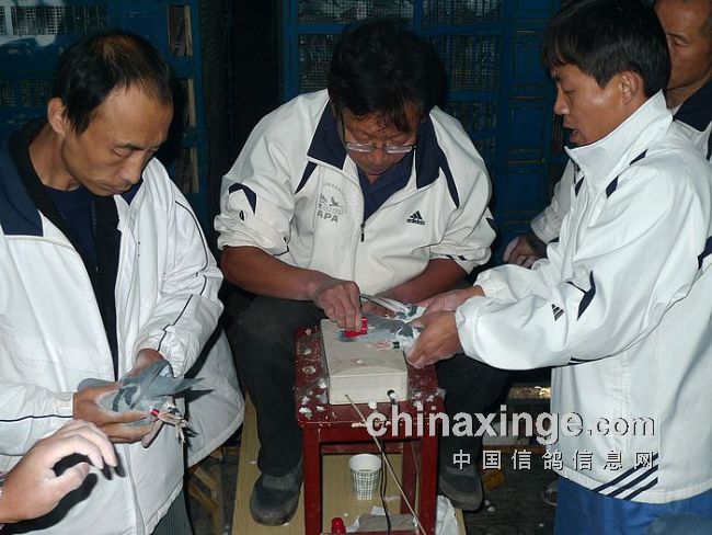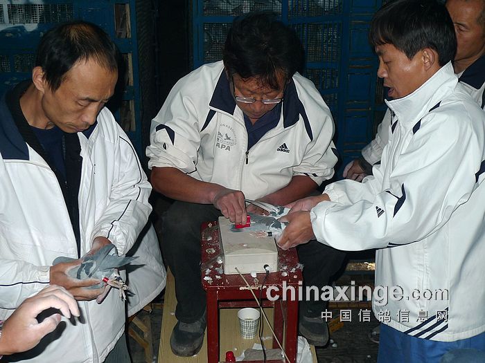 西安威奇公棚经理古波(左)西安市信鸽协会裁判长简伟(中)裁判员辛欣(右)正在核对赛鸽信息