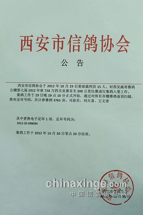 西安威奇赛鸽公棚2012年秋第七届728万四关竞赛