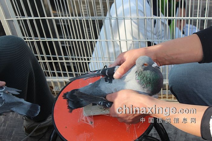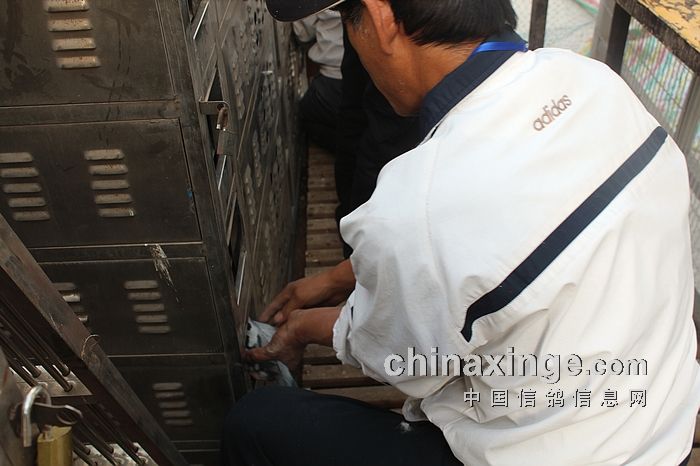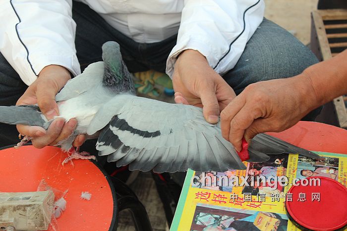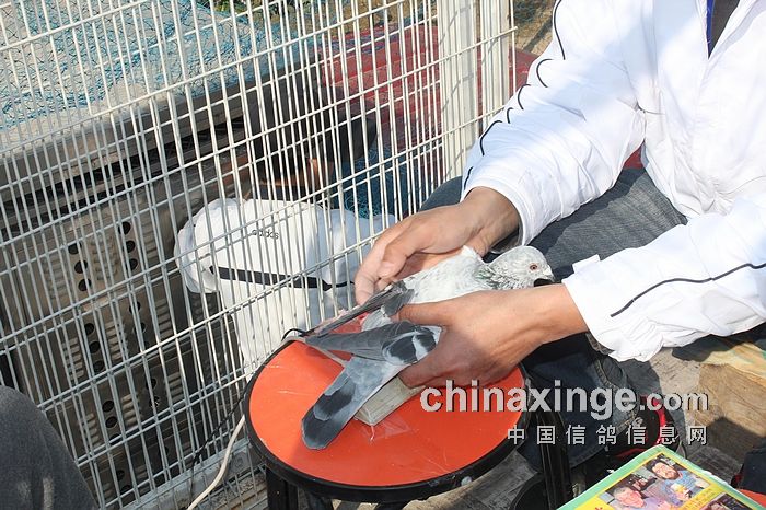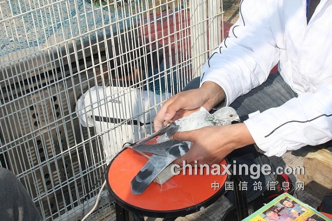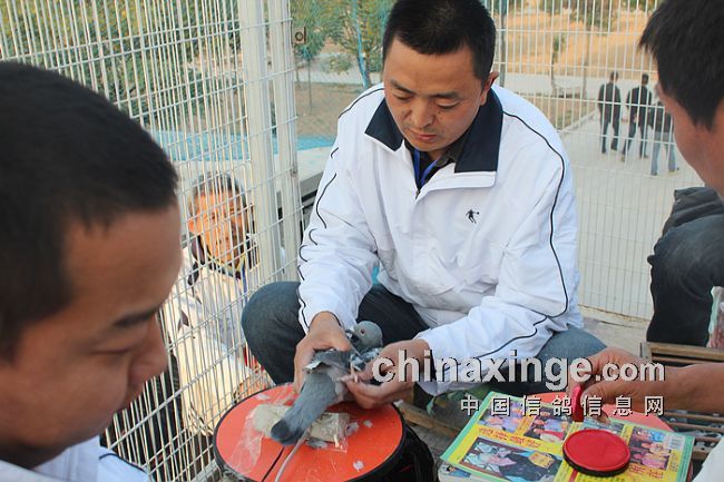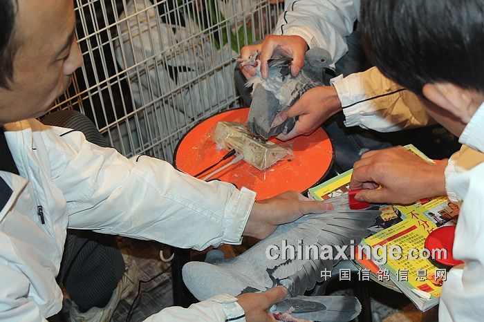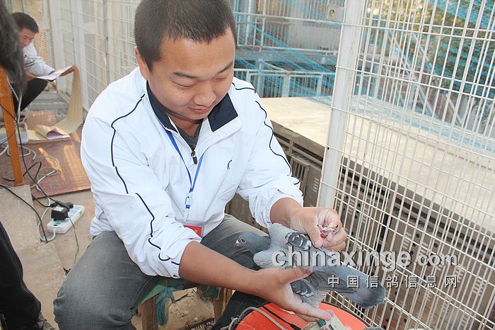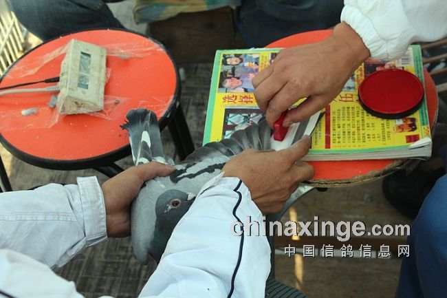 西安市信鸽协会裁判长简伟正在为赛鸽加盖印章