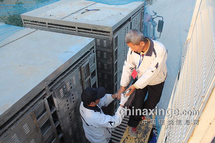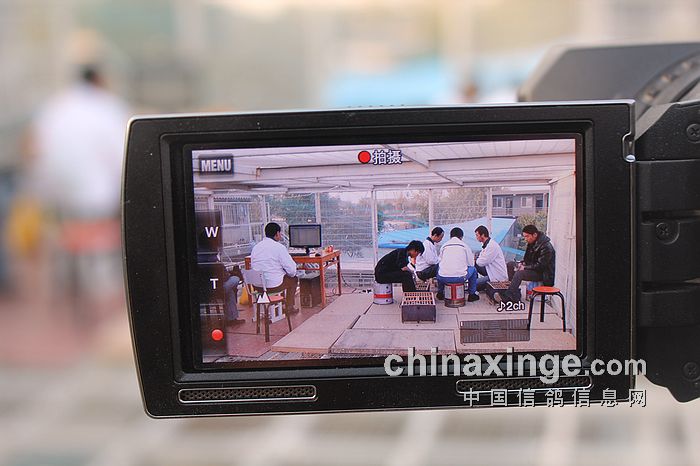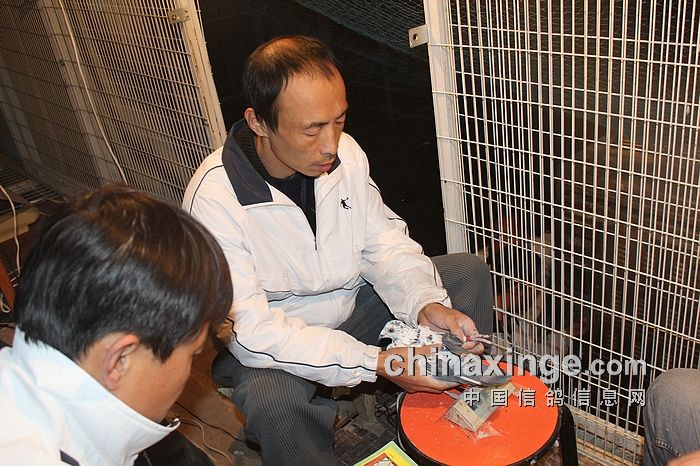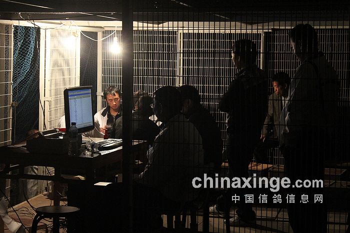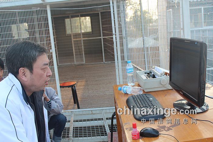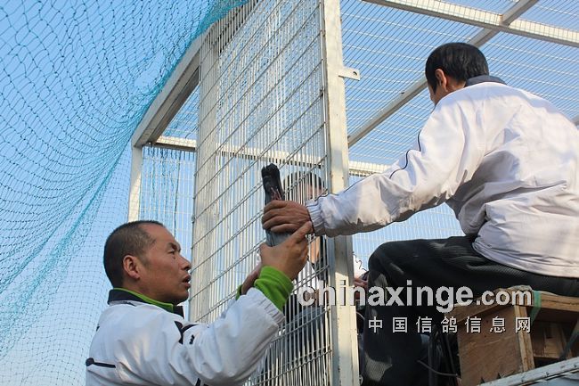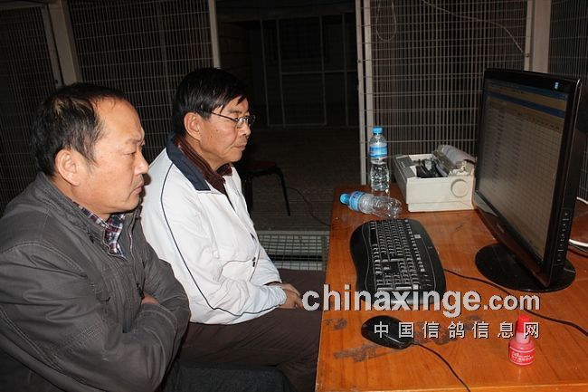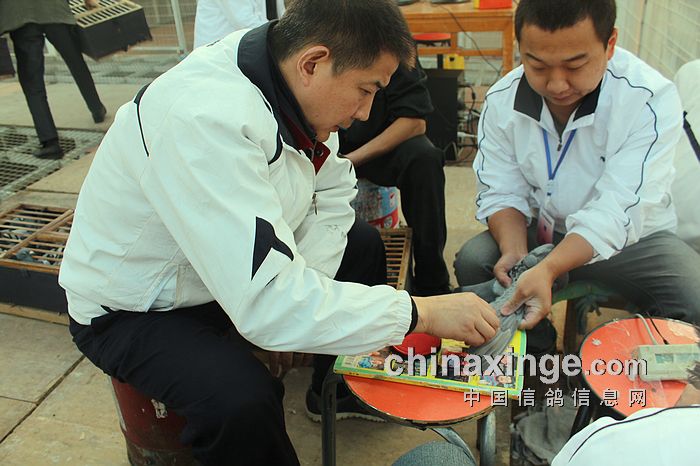 西安威力赛鸽公棚薛永祥经理(左)西安市信鸽协会副秘书长李小刚(右)正在核对赛鸽信息