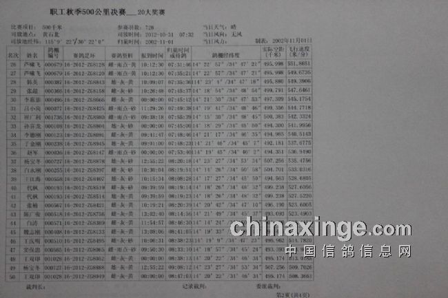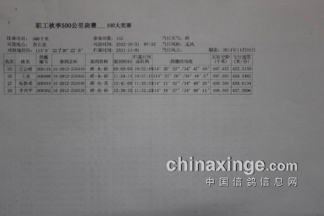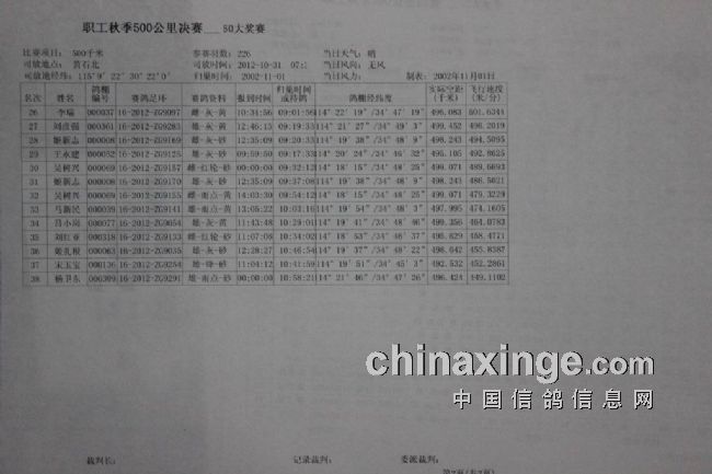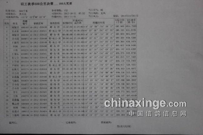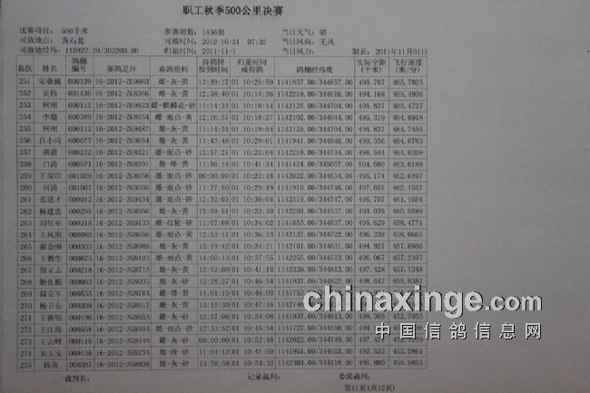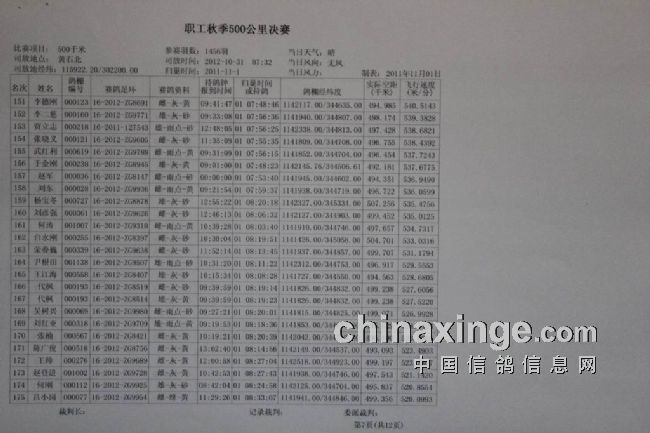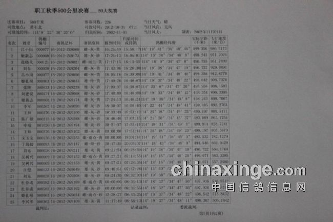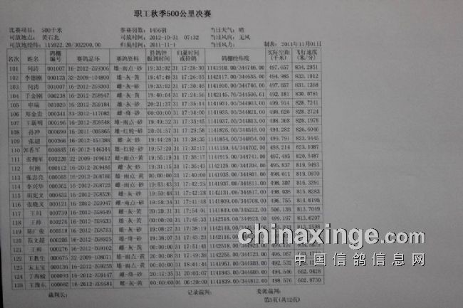 普赛第十一名为刘五成,因足环年份漏输,程序内成绩没有登出,成绩作出更正