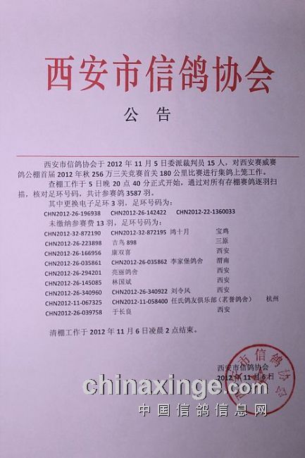 西安赛威赛鸽公棚2012年第一届256万三关竞赛