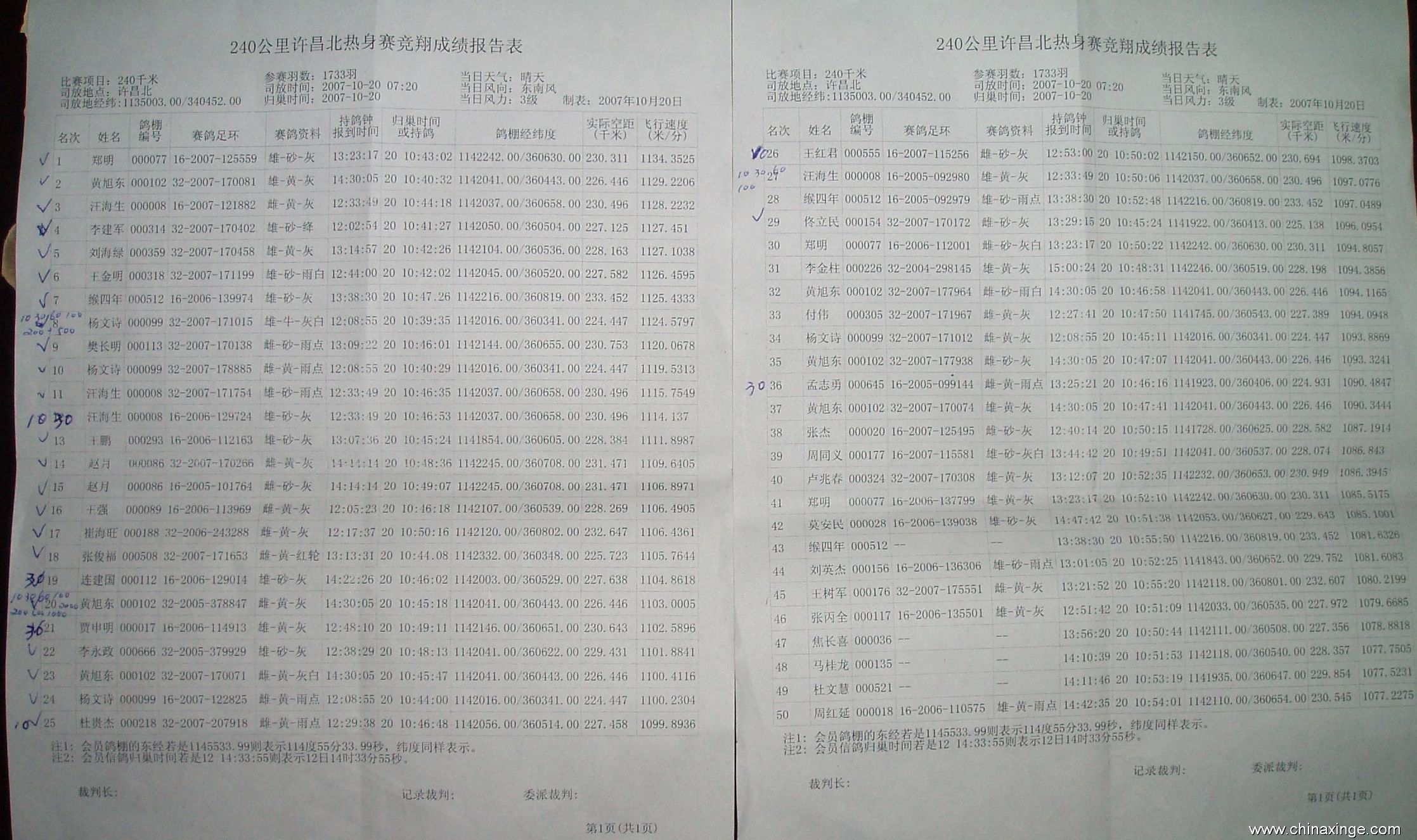 安阳铁路信鸽协会10.20日240公里许昌站1-50名成绩单