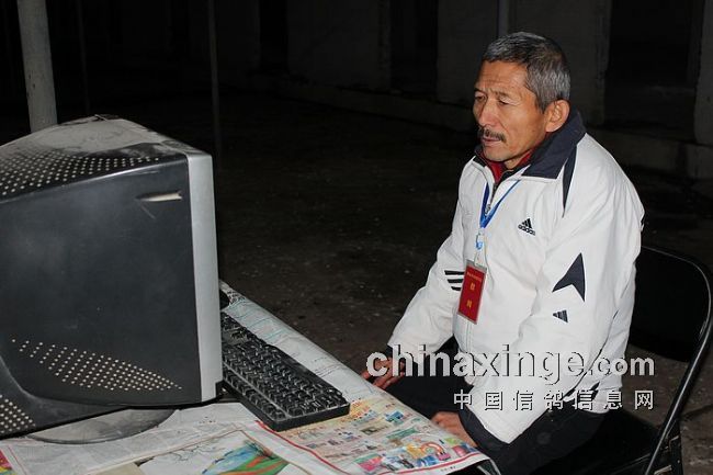 西安市信鸽协会裁判员侯新安(前)正在核对赛鸽信息