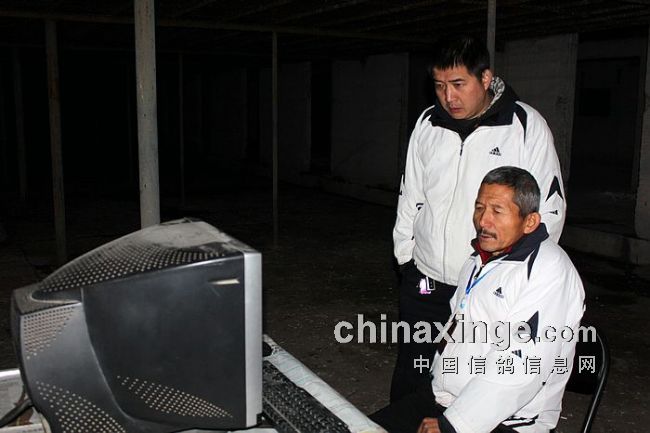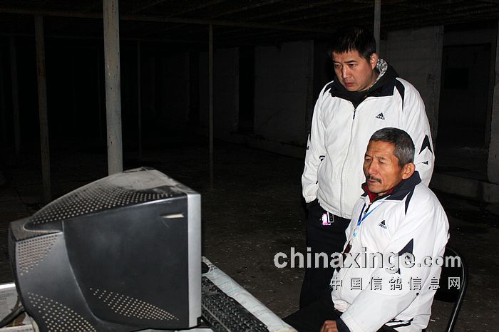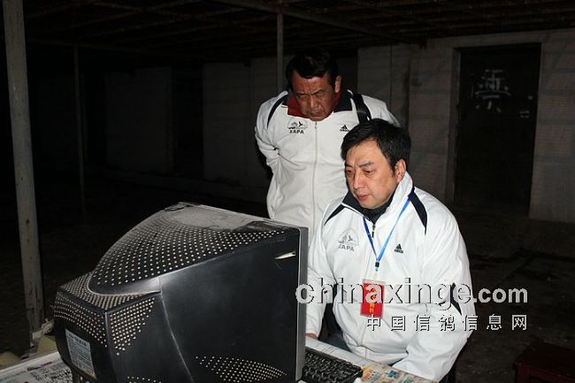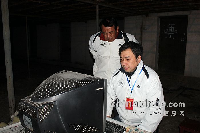 西安市信鸽协会秘书长王长安(后)副裁判长张东辉正在核对赛鸽信息