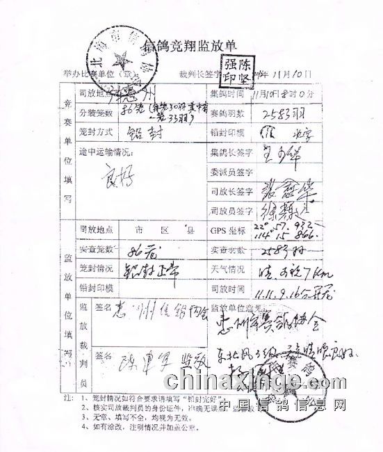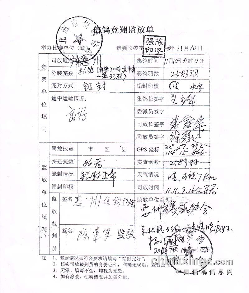 广西北海市信鸽协会2012年下半年惠州站监放单