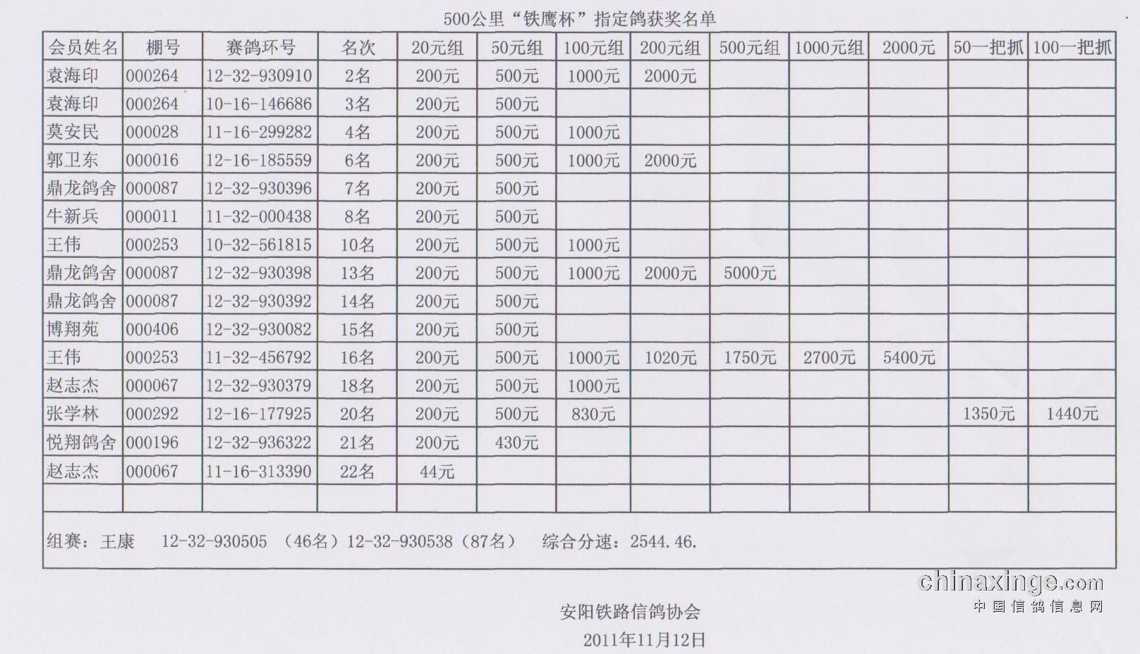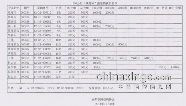 500公里“铁鹰杯”指定鸽成绩