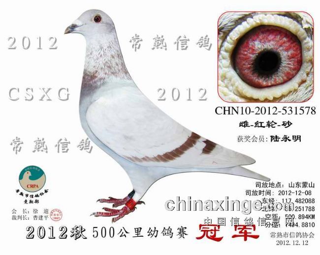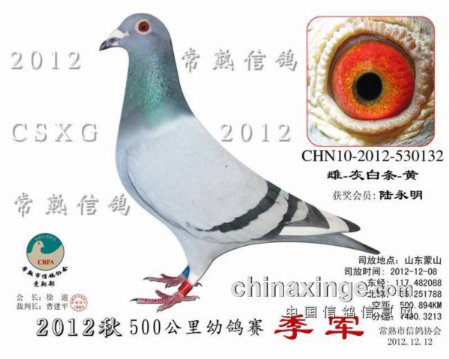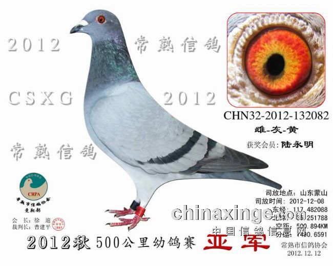 2012秋季500KM蒙山幼鸽赛 安捷赛鸽实时显示系统 司放地点: 山东蒙山 司放时间: 2012-12-08 07:15:00 经纬度: 117.482088 E,35.251788 N -------------------------------------------------------------------------------------------- 名 次 鸽主姓名 棚号 足环号码 归巢时间 空距(千米) 分速(米/分) -------------------------------------------------------------------------------------------- 1 陆永明 050066 2012-10-531578 2012-12-08 12:50:04 500.894 1,494.8810 -------------------------------------------------------------------------------------------- 2 陆永明 050066 2012-32-132082 2012-12-08 12:51:01 500.894 1,490.6591 -------------------------------------------------------------------------------------------- 3 陆永明 050066 2012-10-530132 2012-12-08 12:51:05 500.894 1,490.3213 -------------------------------------------------------------------------------------------- 4 王满宝 050020 2012-10-532585 2012-12-08 12:49:51 498.013 1,487.2179 -------------------------------------------------------------------------------------------- 5 陈文华 050135 2012-10-531267 2012-12-08 12:54:29 504.081 1,484.8315 -------------------------------------------------------------------------------------------- 6 石剑鸣 050213 2012-10-512749 2012-12-08 12:50:31 497.930 1,484.0671 -------------------------------------------------------------------------------------------- 7 邵洪华 050222 2012-10-531276 2012-12-08 12:51:09 498.871 1,484.0336 -------------------------------------------------------------------------------------------- 8 叶 镰 050199 2012-10-531041 2012-12-08 12:50:53 498.036 1,482.7045 -------------------------------------------------------------------------------------------- 9 曹 庆 050349 2012-10-531405 2012-12-08 12:53:54 502.461 1,482.5962 -------------------------------------------------------------------------------------------- 10 徐 野 050023 2012-10-530444 2012-12-08 12:51:14 498.388 1,482.2205 -------------------------------------------------------------------------------------------- 11 叶玉敏 050045 2012-32-134688 2012-12-08 12:53:29 501.293 1,480.9925 -------------------------------------------------------------------------------------------- 12 黄 强 050068 2012-10-530886 2012-12-08 12:56:21 505.241 1,480.1086 -------------------------------------------------------------------------------------------- 13 金晓峰 050317 2012-32-130824 2012-12-08 12:52:56 500.074 1,479.7540 -------------------------------------------------------------------------------------------- 14 钱维国 050287 2012-10-530868 2012-12-08 12:57:01 505.799 1,478.8666 -------------------------------------------------------------------------------------------- 15 枫林鸽舍 050226 2012-10-530489 2012-12-08 12:52:05 498.322 1,478.2711 -------------------------------------------------------------------------------------------- 16 钱友明 050136 2012-10-510708 2012-12-08 12:47:11 490.781 1,477.4001 -------------------------------------------------------------------------------------------- 17 枫林鸽舍 050226 2012-10-530480 2012-12-08 12:52:18 498.322 1,477.3793 -------------------------------------------------------------------------------------------- 18 卢振华 050089 2012-10-512139 2012-12-08 12:55:12 502.565 1,477.2257 -------------------------------------------------------------------------------------------- 19 枫林鸽舍 050226 2012-10-530483 2012-12-08 12:52:23 498.322 1,476.9516 -------------------------------------------------------------------------------------------- 20 姚宇庆 050012 2012-32-131640 2012-12-08 12:54:20 501.187 1,476.9080 -------------------------------------------------------------------------------------------- 21 胡利军 050314 2012-10-530763 2012-12-08 12:54:30 501.278 1,476.4669 -------------------------------------------------------------------------------------------- 22 邵 佳 050400 2012-10-530312 2012-12-08 12:57:36 505.821 1,476.3748 -------------------------------------------------------------------------------------------- 23 姚小传 050280 2012-10-530374 2012-12-08 12:55:02 501.503 1,474.8433 -------------------------------------------------------------------------------------------- 24 王满宝 050020 2012-10-531098 2012-12-08 12:52:42 498.013 1,474.6852 -------------------------------------------------------------------------------------------- 25 枫林鸽舍 050226 2012-10-530484 2012-12-08 12:53:07 498.322 1,473.7978 -------------------------------------------------------------------------------------------- 26 张永华 050032 2012-10-531020 2012-12-08 12:55:05 501.133 1,473.5551 -------------------------------------------------------------------------------------------- 27 汪 浒 050116 2012-10-530072 2012-12-08 13:13:33 528.276 1,473.3253 -------------------------------------------------------------------------------------------- 28 姚小传 050280 2012-32-131631 2012-12-08 12:55:32 501.503 1,472.6353 -------------------------------------------------------------------------------------------- 29 殷新 050242 2012-10-530272 2012-12-08 12:59:38 507.476 1,472.4458 -------------------------------------------------------------------------------------------- 30 邵 佳 050400 2012-32-131828 2012-12-08 12:58:57 505.821 1,470.5980 -------------------------------------------------------------------------------------------- 31 枫林鸽舍 050226 2012-10-530481 2012-12-08 12:53:52 498.322 1,470.5497 -------------------------------------------------------------------------------------------- 32 姚远方 050059 2012-10-512351 2012-12-08 12:57:30 503.168 1,469.0615 -------------------------------------------------------------------------------------------- 33 徐谭 050098 2012-10-530734 2012-12-08 12:54:32 498.763 1,468.9194 -------------------------------------------------------------------------------------------- 34 顾耀良 050238 2012-10-530023 2012-12-08 12:59:23 505.342 1,467.3503