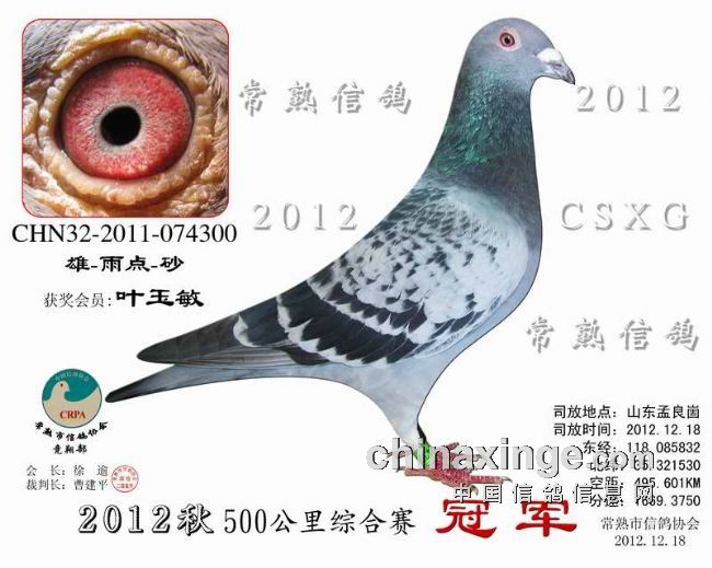 500km综合赛 安捷赛鸽实时显示系统 -------------------------------------------------------------------------------------------- 司放地点: 孟良崮 司放时间: 2012-12-18 07:15:00 经纬度: 118.085832 E,35.321530 N -------------------------------------------------------------------------------------------- 名 次 鸽主姓名 棚号 足环号码 归巢时间 空距(千米) 分速(米/分) -------------------------------------------------------------------------------------------- 1 叶玉敏 050045 2011-32-074300 2012-12-18 12:11:52 495.601 1,669.3750 -------------------------------------------------------------------------------------------- 2 叶玉敏 050045 2012-10-532712 2012-12-18 12:12:29 495.601 1,665.9641 -------------------------------------------------------------------------------------------- 3 曹 庆 050349 2012-10-531405 2012-12-18 12:13:08 496.512 1,665.3662 -------------------------------------------------------------------------------------------- 4 陈根华 050128 2012-32-131786 2012-12-18 12:15:23 500.023 1,664.5905 -------------------------------------------------------------------------------------------- 5 李亚洲 050237 2012-10-530680 2012-12-18 12:11:37 493.686 1,664.3037 -------------------------------------------------------------------------------------------- 6 钱维国 050287 2012-32-130459 2012-12-18 12:15:37 499.812 1,662.5606 -------------------------------------------------------------------------------------------- 7 徐 野 050023 2012-10-530445 2012-12-18 12:11:28 492.674 1,661.7463 -------------------------------------------------------------------------------------------- 8 徐谭 050098 2012-10-530734 2012-12-18 12:11:51 493.133 1,661.1449 -------------------------------------------------------------------------------------------- 9 邓建清 050189 2012-10-131963 2012-12-18 12:11:57 492.789 1,659.5007 -------------------------------------------------------------------------------------------- 10 五星鸽苑 050024 2011-32-076215 2012-12-18 12:12:27 492.966 1,657.2774 -------------------------------------------------------------------------------------------- 11 枫林鸽舍 050226 2012-32-130529 2012-12-18 12:13:04 492.755 1,653.1390 -------------------------------------------------------------------------------------------- 12 赵忠达 050251 2012-10-533251 2012-12-18 12:14:25 493.993 1,649.7706 -------------------------------------------------------------------------------------------- 13 五星鸽苑 050024 2012-10-532057 2012-12-18 12:13:53 492.966 1,649.3225 -------------------------------------------------------------------------------------------- 14 枫林鸽舍 050226 2012-32-130533 2012-12-18 12:13:57 492.755 1,648.2425 -------------------------------------------------------------------------------------------- 15 赵忠达 050251 2012-32-130695 2012-12-18 12:15:07 493.993 1,645.9310 -------------------------------------------------------------------------------------------- 16 枫林鸽舍 050226 2012-32-130522 2012-12-18 12:14:24 492.755 1,645.7203 -------------------------------------------------------------------------------------------- 17 陆建清 050151 2010-10-501055 2012-12-18 12:23:51 507.253 1,642.3732 -------------------------------------------------------------------------------------------- 18 余兴中 050010 2011-10-345302 2012-12-18 12:21:35 498.176 1,624.8640 -------------------------------------------------------------------------------------------- 19 钱友明 050136 2012-10-532750 2012-12-18 12:13:58 485.394 1,623.5461 -------------------------------------------------------------------------------------------- 20 邵振泉 050205 2012-10-530288 2012-12-18 12:19:56 494.947 1,623.0680 -------------------------------------------------------------------------------------------- 21 邵永宁 050033 2012-32-135286 2012-12-18 12:15:31 487.407 1,621.8428 -------------------------------------------------------------------------------------------- 22 邵永宁 050033 2012-32-130791 2012-12-18 12:15:34 487.407 1,621.5685 -------------------------------------------------------------------------------------------- 23 陆心语 050008 2012-32-130541 2012-12-18 12:18:50 492.631 1,621.3438 -------------------------------------------------------------------------------------------- 24 陶卓越 050027 2012-10-531218 2012-12-18 12:20:18 494.713 1,620.3293 -------------------------------------------------------------------------------------------- 25 周培琛 050196 2012-10-532774 2012-12-18 12:19:12 492.637 1,619.4004 -------------------------------------------------------------------------------------------- 26 邵 佳 050400 2012-10-530310 2012-12-18 12:23:55 499.797 1,617.8840 -------------------------------------------------------------------------------------------- 27 卢振华 050089 2012-10-512139 2012-12-18 12:22:10 496.933 1,617.7934 -------------------------------------------------------------------------------------------- 28 邵洪华 050222 2012-32-130737 2012-12-18 12:19:55 493.244 1,617.5627 -------------------------------------------------------------------------------------------- 29 徐谭 050098 2012-10-530733 2012-12-18 12:19:51 493.133 1,617.5623 -------------------------------------------------------------------------------------------- 30 邵洪华 050222 2012-10-531019 2012-12-18 12:19:56 493.244 1,617.5309 -------------------------------------------------------------------------------------------- 31 邓建清 050189 2012-10-510006 2012-12-18 12:19:41 492.789 1,617.2960 -------------------------------------------------------------------------------------------- 32 徐谭 050098 2012-10-533098 2012-12-18 12:19:56 493.133 1,617.1618 -------------------------------------------------------------------------------------------- 33 枫林鸽舍 050226 2011-32-081849 2012-12-18 12:19:45 492.755 1,616.8554 ------------------------------------------------------------------------------------