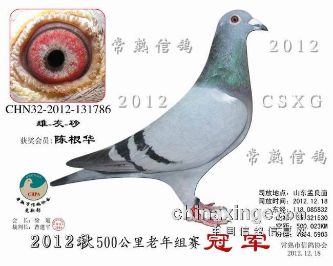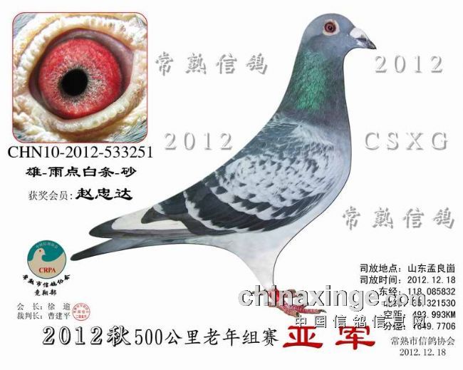 -------------------------------------------------------------------------------------------- 司放地点: 孟良崮 司放时间: 2012-12-18 07:15:00 经纬度: 118.085832 E,35.321530 N -------------------------------------------------------------------------------------------- 名 次 鸽主姓名 棚号 足环号码 归巢时间 空距(千米) 分速(米/分) -------------------------------------------------------------------------------------------- 1 陈根华 050128 2012-32-131786 2012-12-18 12:15:23 500.023 1,664.5905 -------------------------------------------------------------------------------------------- 2 赵忠达 050251 2012-10-533251 2012-12-18 12:14:25 493.993 1,649.7706 -------------------------------------------------------------------------------------------- 3 余兴中 050010 2011-10-345302 2012-12-18 12:21:35 498.176 1,624.8640 -------------------------------------------------------------------------------------------- 4 周培琛 050196 2012-10-532774 2012-12-18 12:19:12 492.637 1,619.4004 -------------------------------------------------------------------------------------------- 5 袁建荣 050311 2012-10-530291 2012-12-18 12:22:25 494.512 1,608.6033 -------------------------------------------------------------------------------------------- 6 何顺祥 050180 2011-10-346169 2012-12-18 12:22:57 494.398 1,605.4316 -------------------------------------------------------------------------------------------- 7 薛建中 050015 2011-10-516110 2012-12-18 12:22:20 493.305 1,605.0495 -------------------------------------------------------------------------------------------- 8 杨祝平 050187 2012-10-530594 2012-12-18 12:23:28 494.935 1,604.4297 -------------------------------------------------------------------------------------------- 9 邓福生 050034 2012-10-512268 2012-12-18 12:22:06 492.332 1,603.0903 -------------------------------------------------------------------------------------------- 10 俞天钢 050006 2012-32-131710 2012-12-18 12:26:49 495.546 1,589.2062 -------------------------------------------------------------------------------------------- 14 赵忠达 050251 2012-32-130696 2012-12-18 12:26:06 493.993 1,587.8318 -------------------------------------------------------------------------------------------- 15 陈根华 050128 2012-32-134277 2012-12-18 12:31:44 500.023 1,578.6594 -------------------------------------------------------------------------------------------- 16 盛建清 050086 2012-10-531892 2012-12-18 12:28:47 495.364 1,578.6129 -------------------------------------------------------------------------------------------- 17 陈根华 050128 2012-32-130271 2012-12-18 12:32:02 500.023 1,577.1432 -------------------------------------------------------------------------------------------- 18 薛建中 050015 2011-10-342885 2012-12-18 12:28:19 493.305 1,574.3911 -------------------------------------------------------------------------------------------- 19 盛建清 050086 2012-10-533086 2012-12-18 12:30:28 495.364 1,570.1906 -------------------------------------------------------------------------------------------- 20 邓福生 050034 2012-10-511622 2012-12-18 12:29:46 492.332 1,564.0453 -------------------------------------------------------------------------------------------- 21 王满宝 050020 2012-10-532594 2012-12-18 12:30:11 492.398 1,562.2218 -------------------------------------------------------------------------------------------- 22 张禹成 050181 2011-10-335186 2012-12-18 12:45:57 516.727 1,561.3061 -------------------------------------------------------------------------------------------- 23 何顺祥 050180 2011-10-346161 2012-12-18 12:31:48 494.398 1,560.5505 -------------------------------------------------------------------------------------------- 24 王满宝 050020 2011-10-343009 2012-12-18 12:31:30 492.398 1,555.7419 -------------------------------------------------------------------------------------------- 25 薛建中 050015 2012-10-530557 2012-12-18 12:32:53 493.305 1,551.8210 -------------------------------------------------------------------------------------------- 26 薛建中 050015 2012-10-530552 2012-12-18 12:33:58 493.305 1,546.5610 -------------------------------------------------------------------------------------------- 27 何顺祥 050180 2012-10-510178 2012-12-18 12:35:39 494.398 1,541.8490 -------------------------------------------------------------------------------------------- 28 何顺祥 050180 2012-10-530520 2012-12-18 12:37:41 494.398 1,532.0772 -------------------------------------------------------------------------------------------- 29 俞天钢 050006 2012-32-130254 2012-12-18 12:38:29 495.546 1,531.8301 -------------------------------------------------------------------------------------------- 30 何顺祥 050180 2012-10-532359 2012-12-18 12:37:50 494.398 1,531.4152 -------------------------------------------------------------------------------------------- 31 袁建荣 050311 2010-10-509839 2012-12-18 12:38:46 494.512 1,527.3220 -------------------------------------------------------------------------------------------- 32 王满宝 050020 2012-10-530553 2012-12-18 12:38:29 492.398 1,522.1374 -------------------------------------------------------------------------------------------- 33 王满宝 050020 2012-10-510290 2012-12-18 12:39:25 492.398 1,517.7755 -------------------------------------------------------------------------------------------- 34 薛建中 050015 2012-10-533015 2012-12-18 12:40:56 493.305 1,513.4601 -------------------------------------------------------------------------------------------- 35 王满宝 050020 2012-10-532584 2012-12-18 12:41:05 492.398 1,509.9956 -------------------------------------------------------------------------------------------- 36 何顺祥 050180 2012-10-530521 2012-12-18 12:43:12 494.398 1,506.3871 -------------------------------------------------------------------------------------------- 37 薛建中 050015 2011-10-342883 2012-